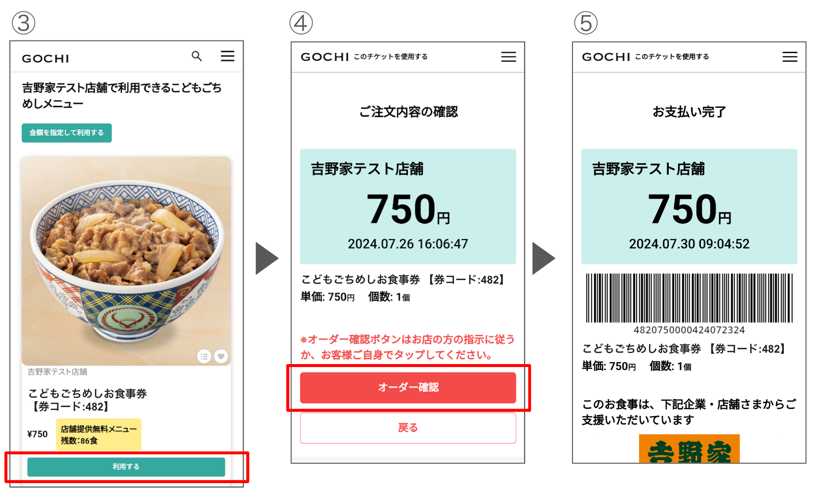 ③ユーザーは、登録飲食店でのお食事チケットを提示すると食事ができます。