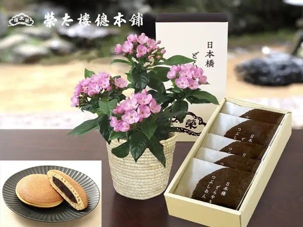 紅茶で有名なインドのアッサム地方原産で桜のような上品なピンク色から「アッサム匂い桜」の別名もある可憐な花の鉢植えと、老舗<榮太樓總本鋪>のどらやきのセットです。
