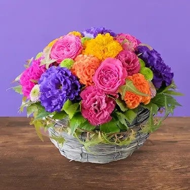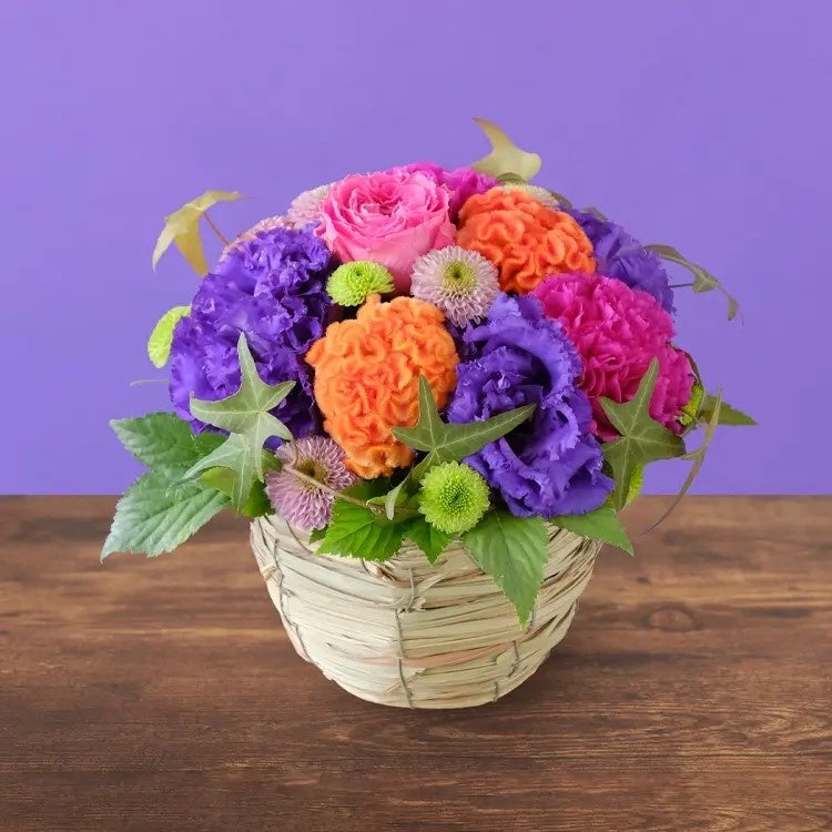 鮮やかな色合いで華やかながらも、どこか「和」の趣きも感じさせる生花のアレンジメントです。器付きのため花瓶に移し替える必要がなく、そのまま飾っていただけます。ご予算に合わせてお選びください。