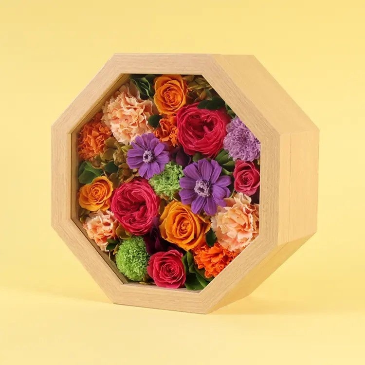 お手入れのいらない「枯れない花」プリザーブドフラワーをフレームにデザインしました。花園に咲き誇る花々を閉じ込めたような贅沢な贈り物です。