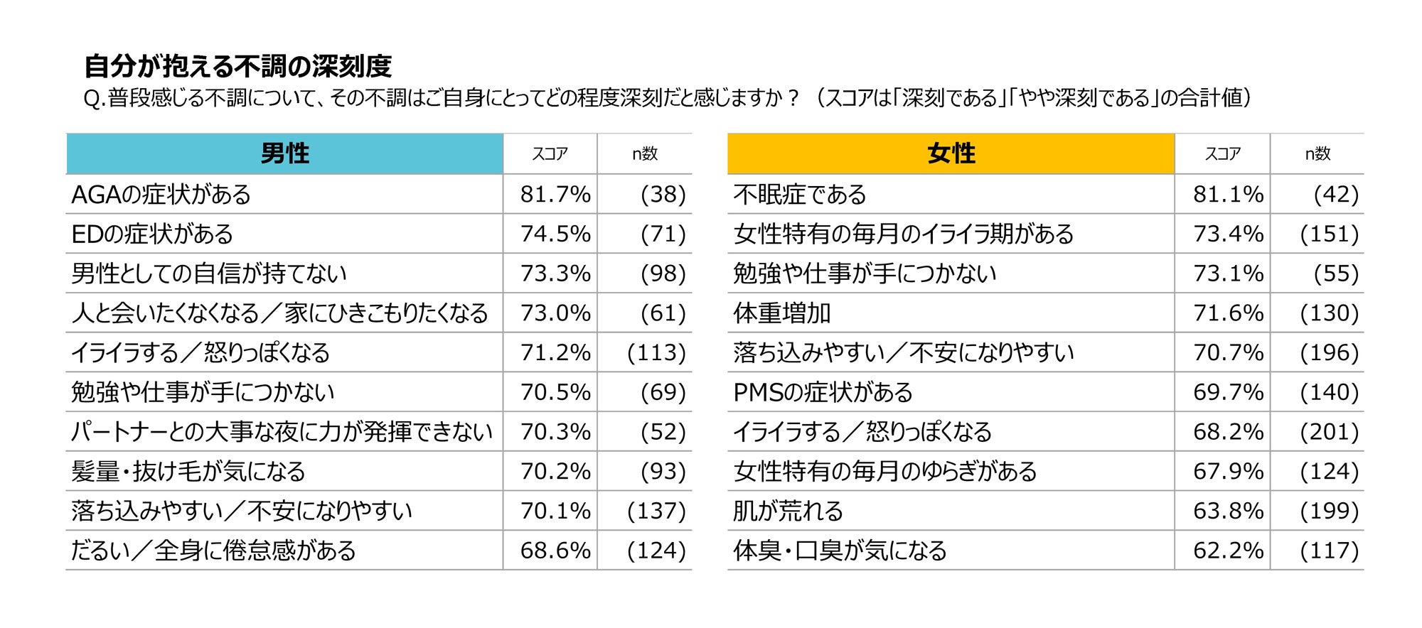 普段感じている不調の深刻度は、男性は「AGAの症状がある」(81.7%)、「EDの症状がある」(74.5%)、「男性としての自信が持てない」(73.3%)の順でした。また、女性は「不眠症である」(81.1%)、「女性特有の毎月のイライラ期がある」(73.4%)、「勉強や仕事が手につかない」(73.1%)の順となりました[図4]。