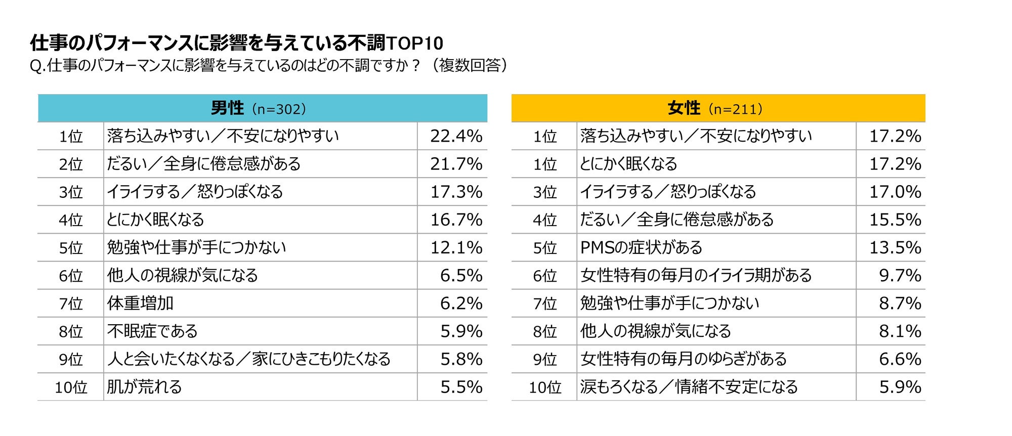 プレゼンティーズムの要因となるのは、男女ともに「落ち込みやすい/不安になりやすい」を筆頭に、「だるさ」 「イライラ」「眠気」などが共通しています。5位以降は男女差があり、女性では「PMSの症状がある」(13.5%)や「女性特有の毎月のイライラ期がある」(9.7%)なども仕事のパフォーマンス低下の原因となっています。