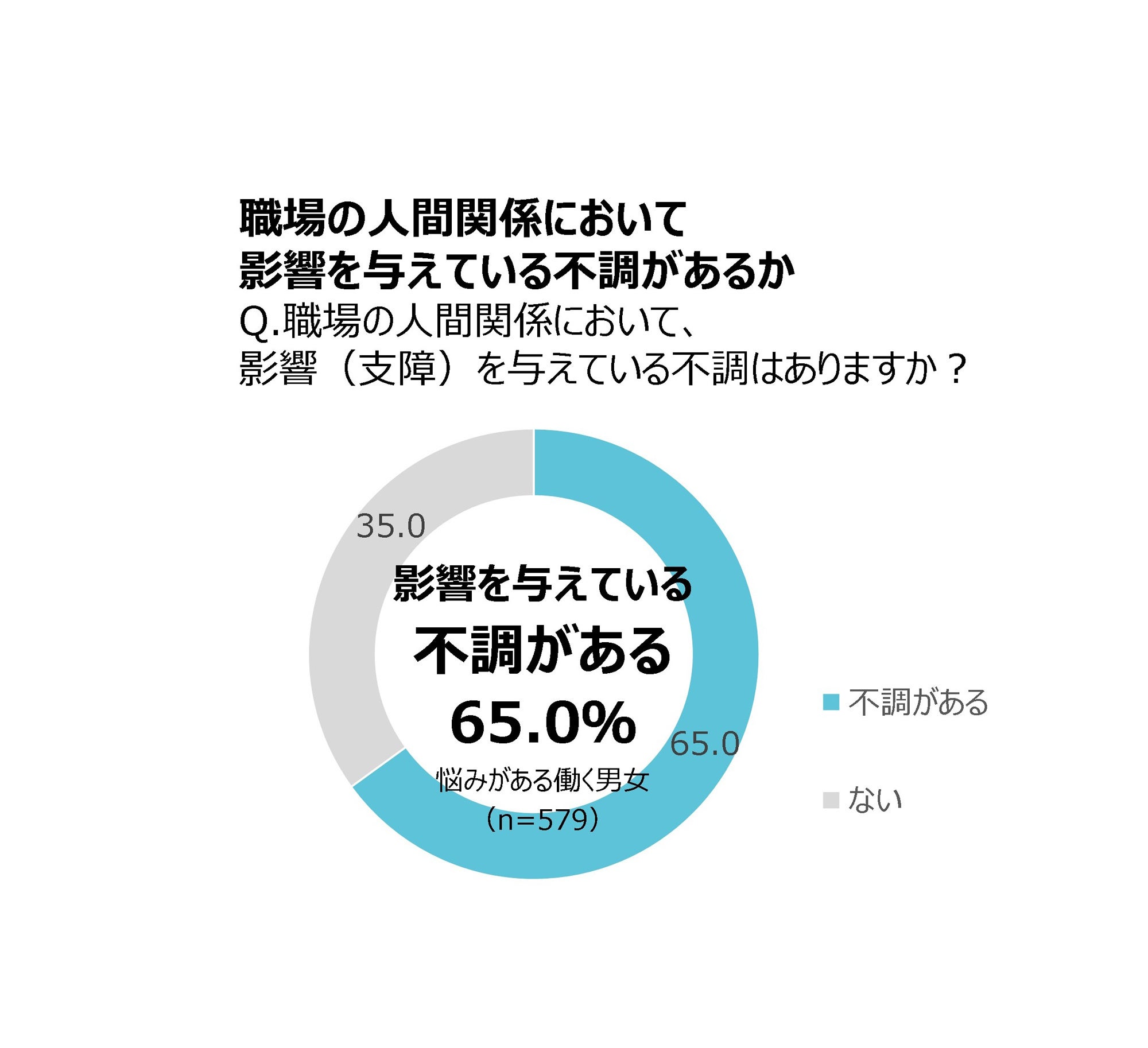 [図1]で何らかの悩みがあると回答した若年層のうち、働く男女579人に、職場の人間関係において影響を与えている不調があるか聞いたところ、全体の65.0%が「影響を与えている不調がある」と回答しています[図2]。
