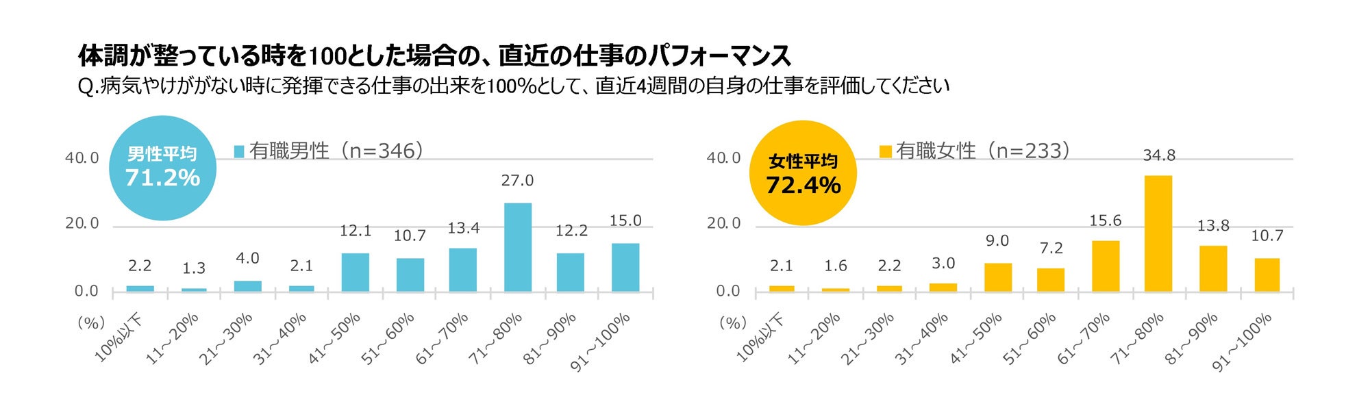 不調により仕事のパフォーマンスがどの程度落ちるのか、病気やけががない時を100%として、直近の自身の仕事を0~100%で評価してもらいました。すると平均で男性は71.2%、女性は72.4%となり、男女とも不調によるパフォーマンス低下はおよそ3割と推測されます[図6-2]。