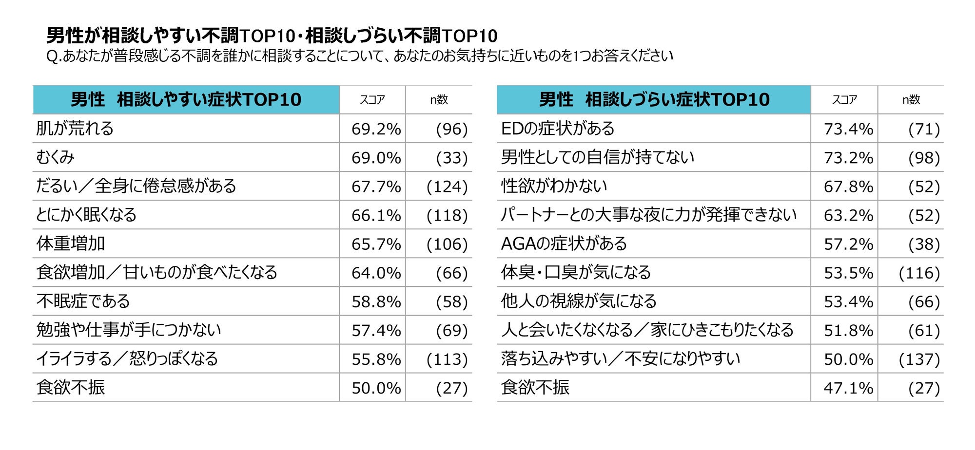 男性が相談しやすい不調の症状は「肌が荒れる」(69.2%)、「むくみ」(69.0%)、「だるい/全身に倦怠感がある」(67.7%)の順で、逆に相談しづらい症状は「EDの症状がある」(73.4%)、「男性としての自信が持てない」(73.2%)、「性欲がわかない」(67.8%)が上位に挙げられました[図8-1]。