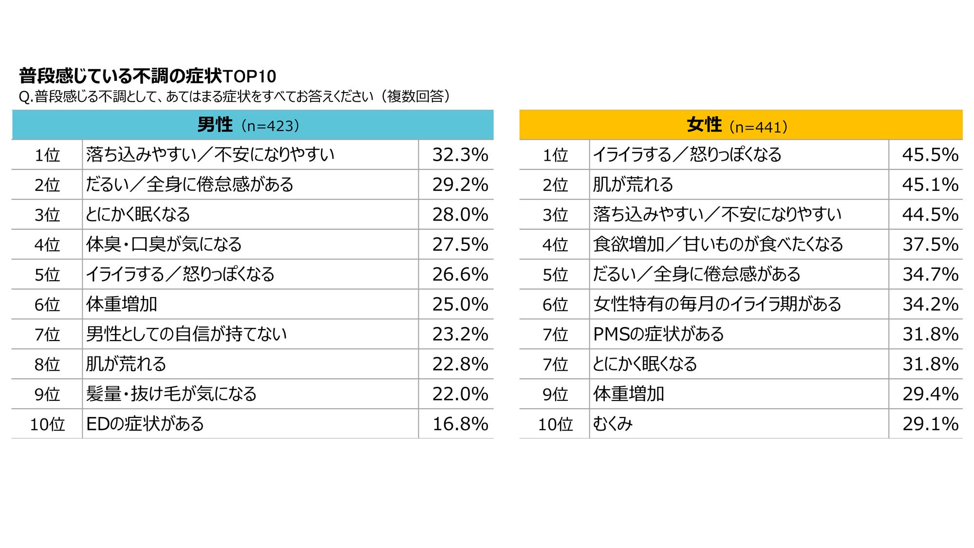男性は「不安」や「倦怠感」、女性は「イライラ」や「肌荒れ」に悩まされている