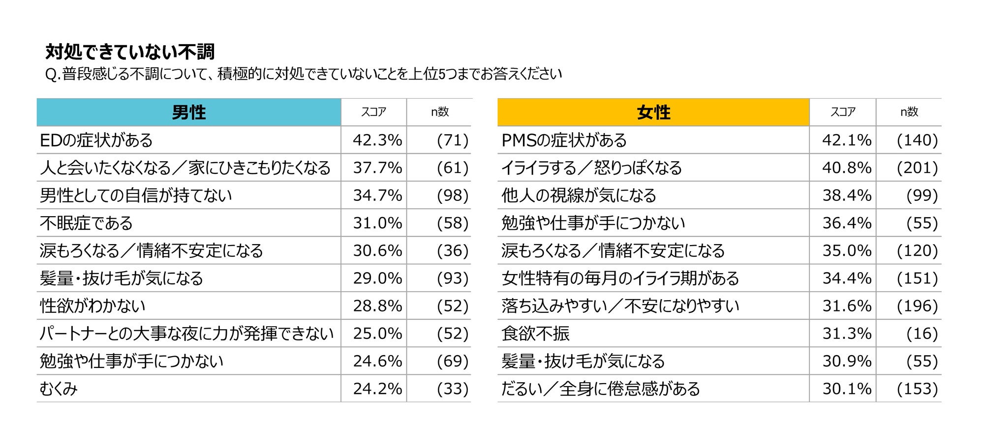 深刻に感じる一方、対処できていない不調 第1位 男性「ED※1症状」、女性「PMS※2症状」