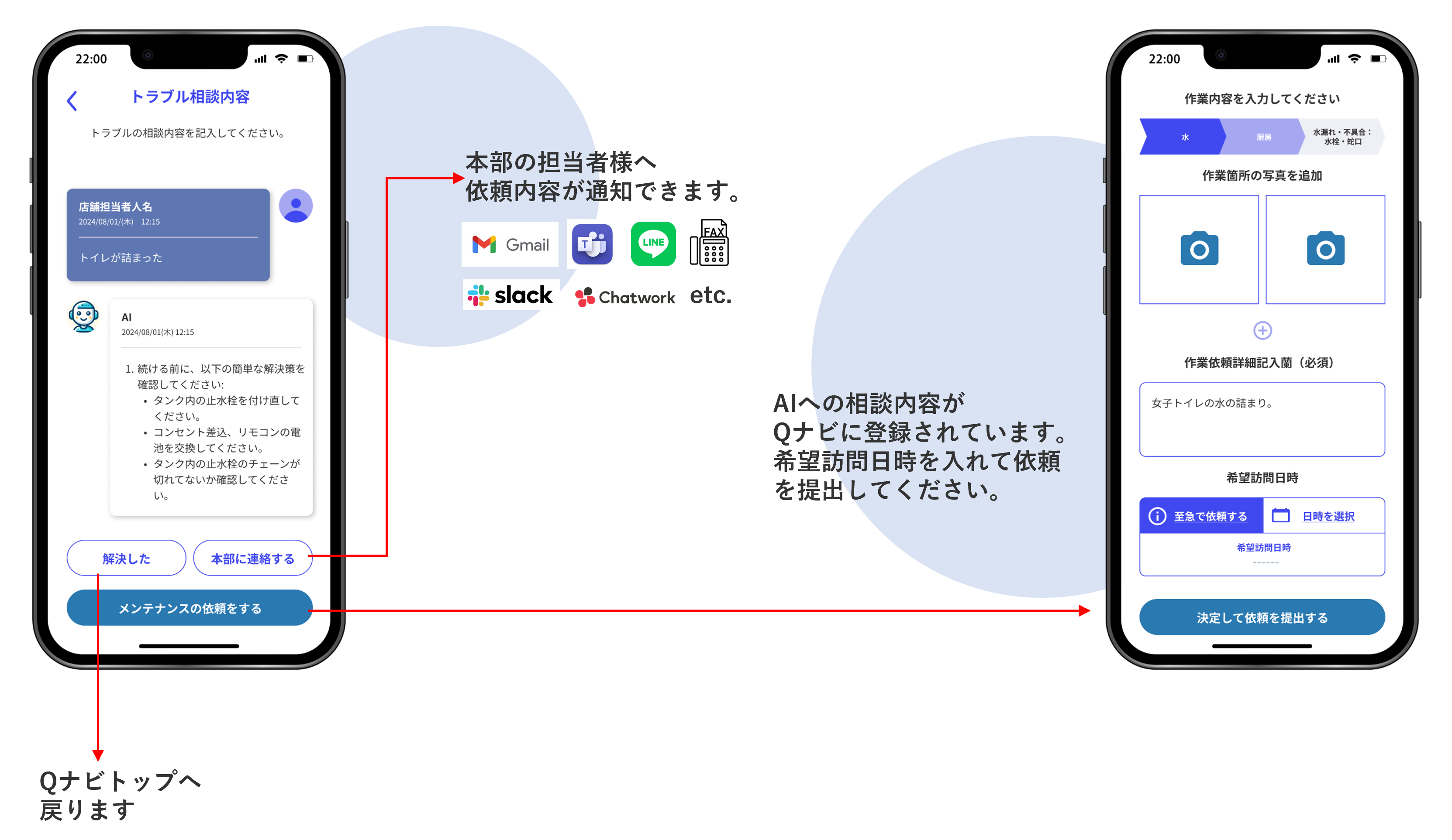 4.AIへの相談内容がQナビに登録され、業者の訪問希望日時を入れて依頼を提出する