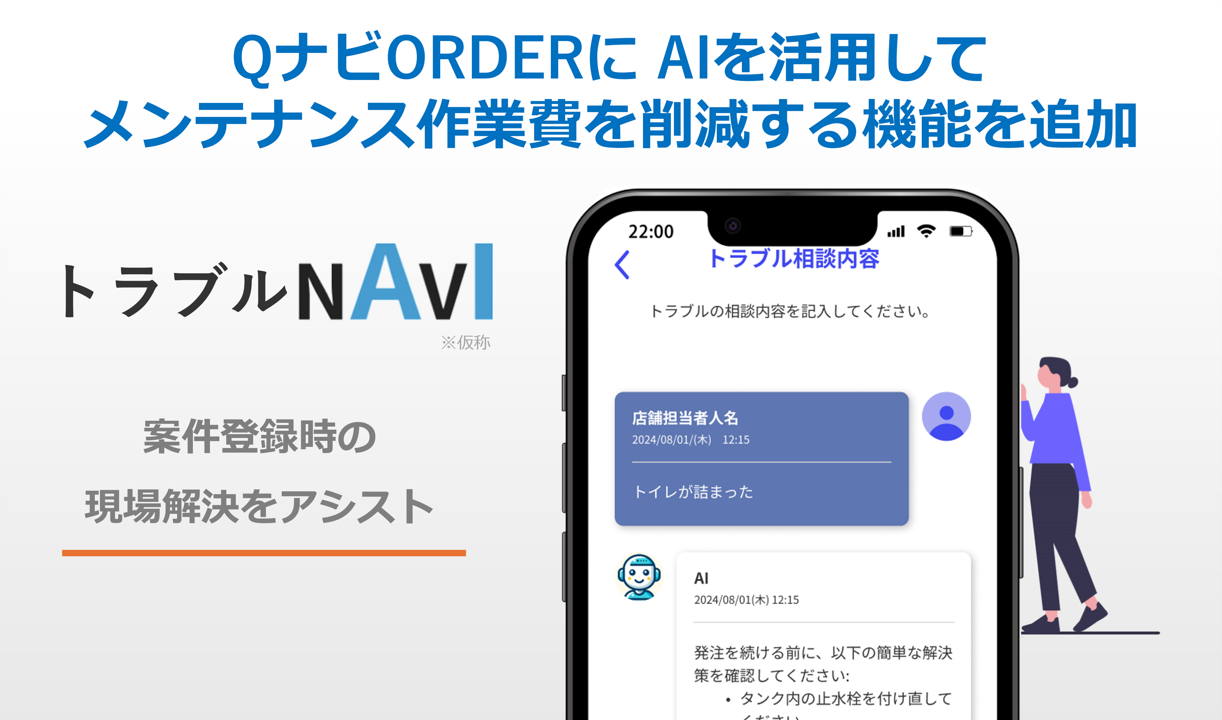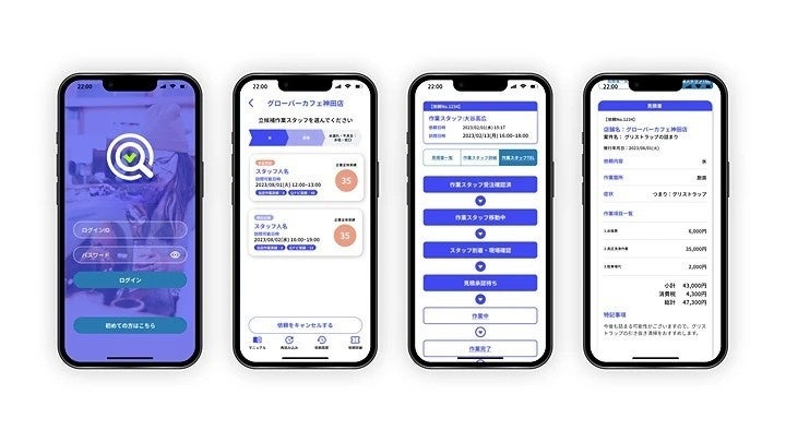 「QナビORDER」は、店舗ビジネスで突発的に発生する空調や水回り、漏電等のトラブル時に最短30秒(※1)で業者とマッチング、定期メンテナンスの管理ができるアプリサービスです。
