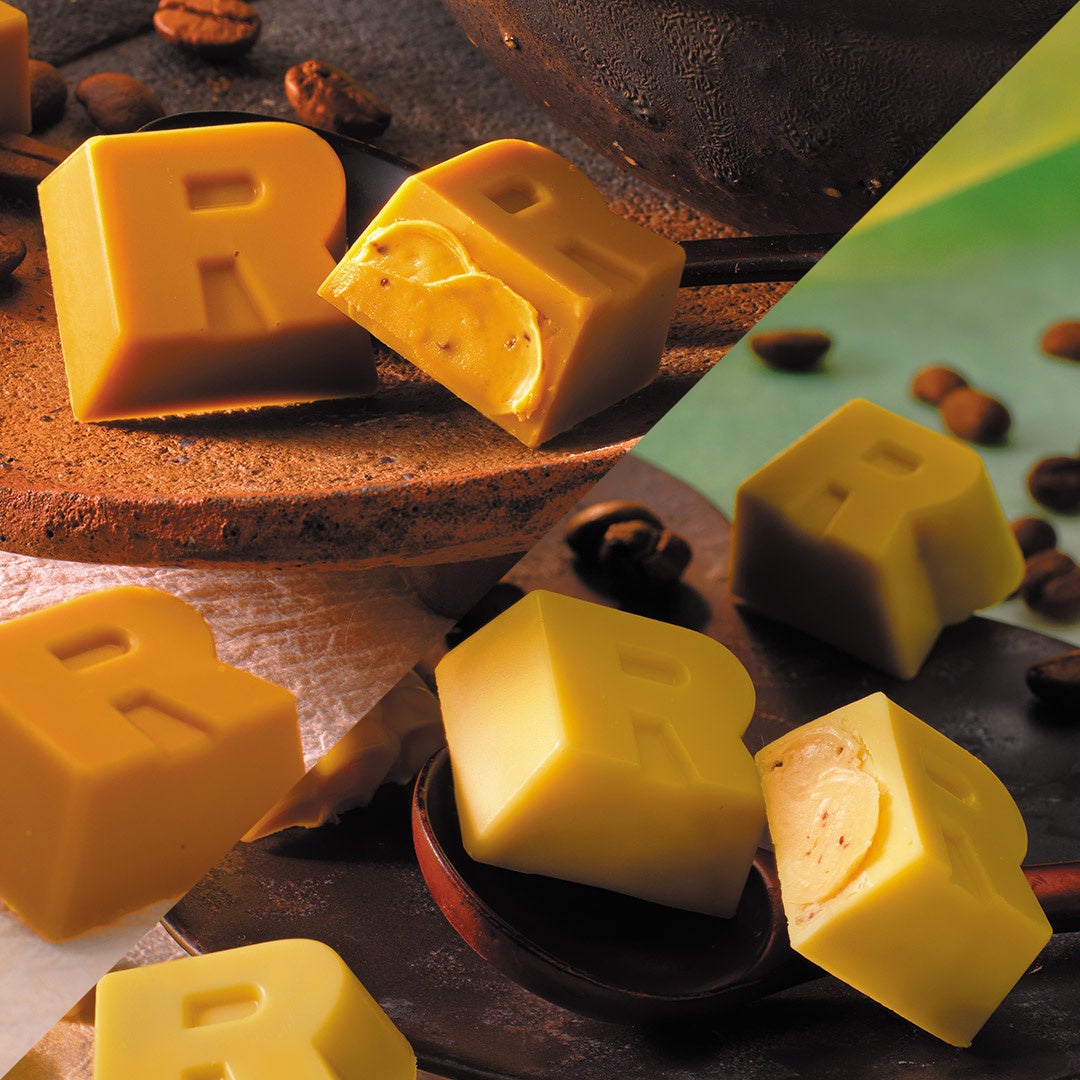 北海道のとうもろこし・かぼちゃのチョコレートとクリームに、京都 小川珈琲の香り高いコーヒーを合わせた、R型のショコラ。コクのある甘みのポタージュに、コーヒーのほろ苦さをプラスしたイメージでつくりました。[とうもろこし]・[かぼちゃ]の2種類のセットです。