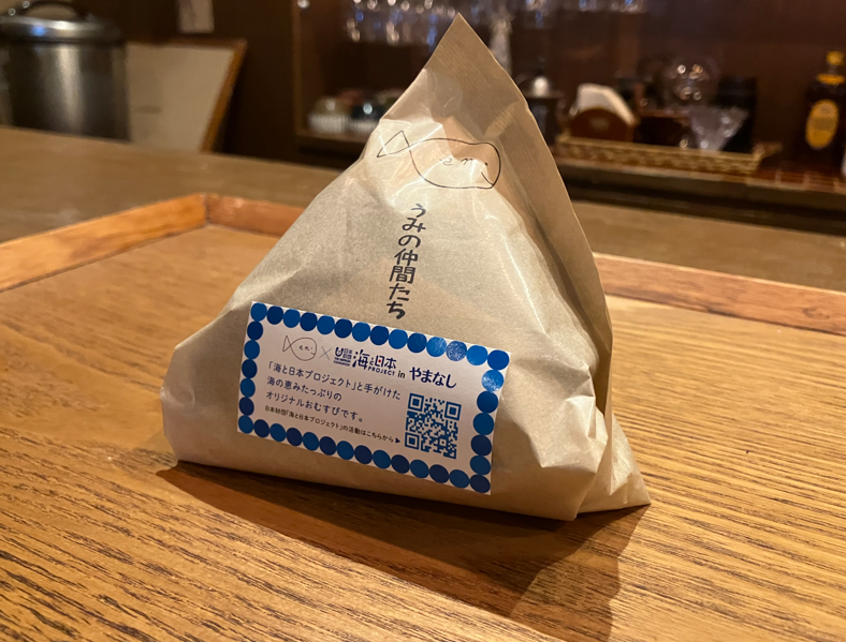 魚介類が好きな山梨県民に特に愛されている「ツナマヨ」「しらす」「さけ」の3種の「うみの仲間たち」をおいしいお米で優しく包みました。その仲間たちは今、海水温の上昇に頭を悩ませています。原因は地球温暖化、日本近海では100年で1.28℃上昇しました。節電やリサイクル、食品ロス削減で温暖化を抑えることができます。うみの仲間たちを守り、豊かな海を未来につないでいく。あなたもその「仲間」の一人であると感じてほしい、そんな願いも込められたおむすびです。店主の今村恭子さんは「おむすびは、日本の主食のお米、そして、海苔や塩をはじめ海からの贈り物を感謝の思いで真心を込めて優しくむすんでいます。山梨には海が無いですが、世の中の全ての物流のおかげで食べることができていることに感謝し、プロジェクトを通して改めて、食の大切さを学ばせていただきました」と語っています。