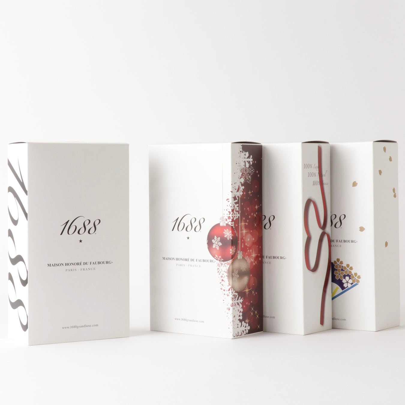 黒と白が基調のレギュラーBoxがございます。200mlペアセットは4種類のレパートリーがあります。その他、2024年新登場のトリコロールBoxはフランス国旗の青と赤が配色されています。