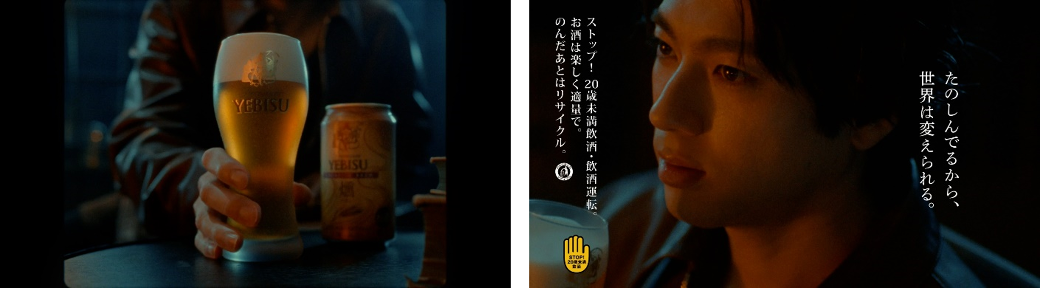 焚火の前でビールを嗜む様子は、これまでにない大人の雰囲気を醸し出し、ヱビスのビールづくりへの姿勢を表情や目からも表現。“燻製”という新たなヱビスの挑戦を山田さんらしく表現し、味わいの深い映像に仕上げました。