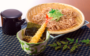 サガミ自慢の大海老天ぷらと、ごま油香るアツアツなつゆにそばをつけてお召し上がりください。