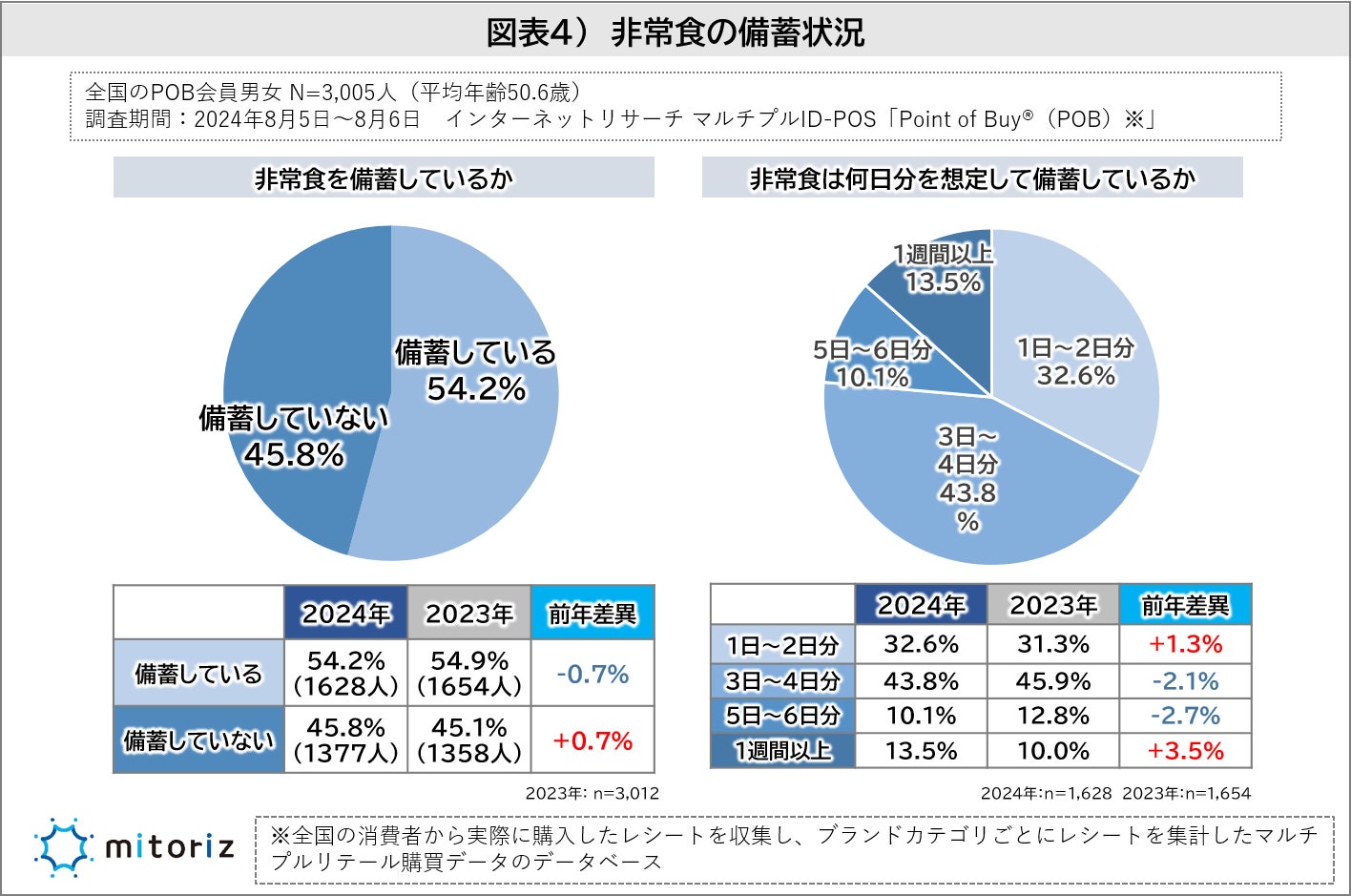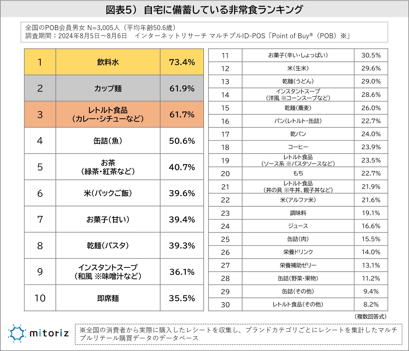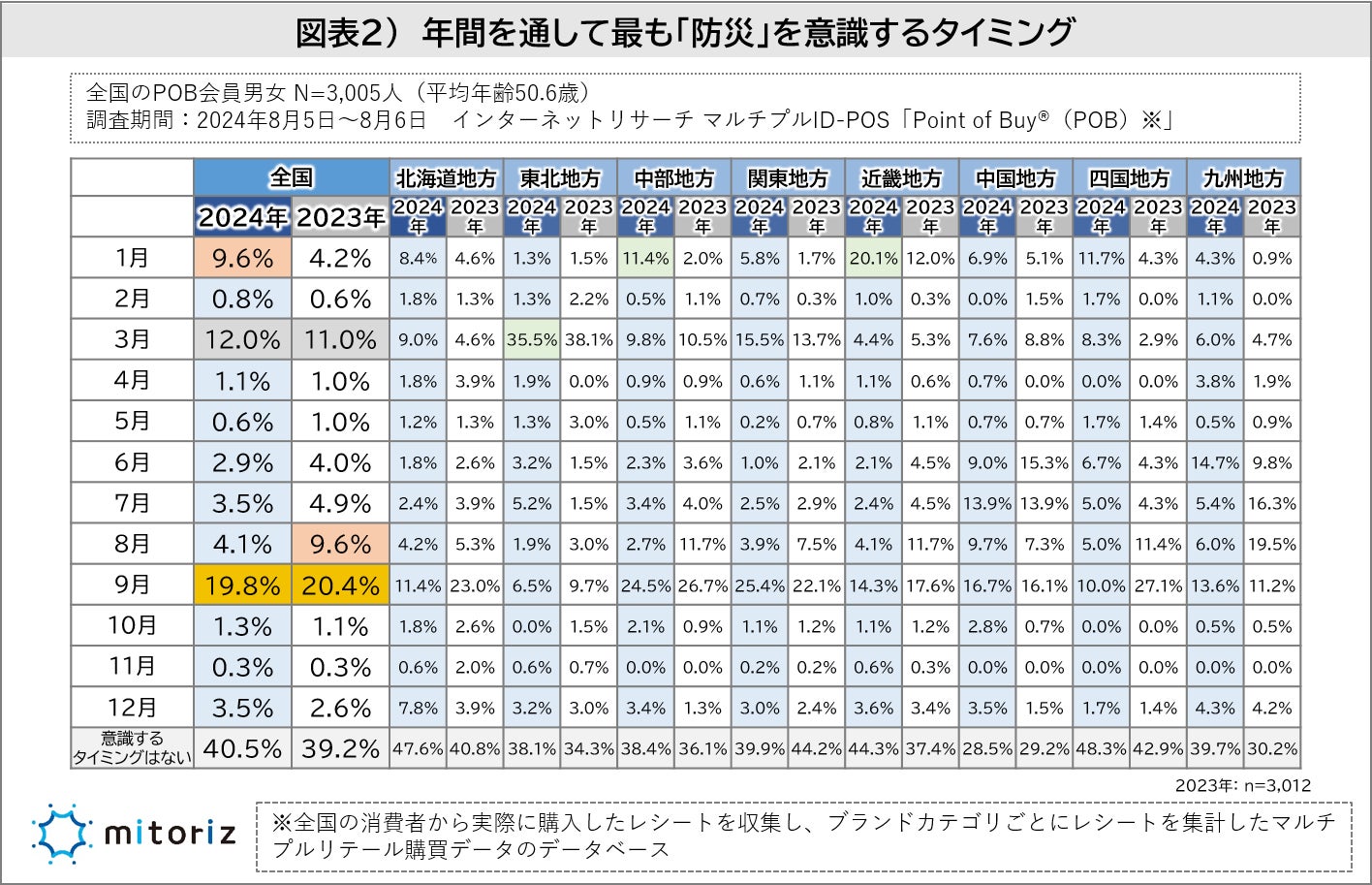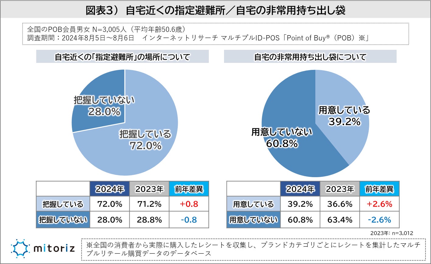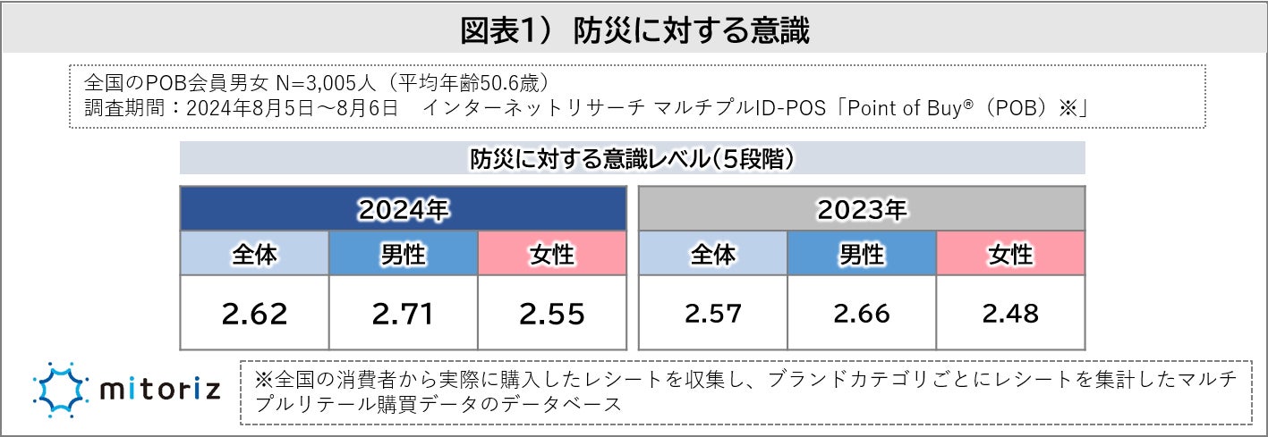 株式会社mitoriz(本社:東京都港区、代表取締役社長:木名瀬博)は、消費者購買行動データサービス「Point of Buy®(以下、POB)」の会員3,005人に「防災に関する調査」を実施致しました。
