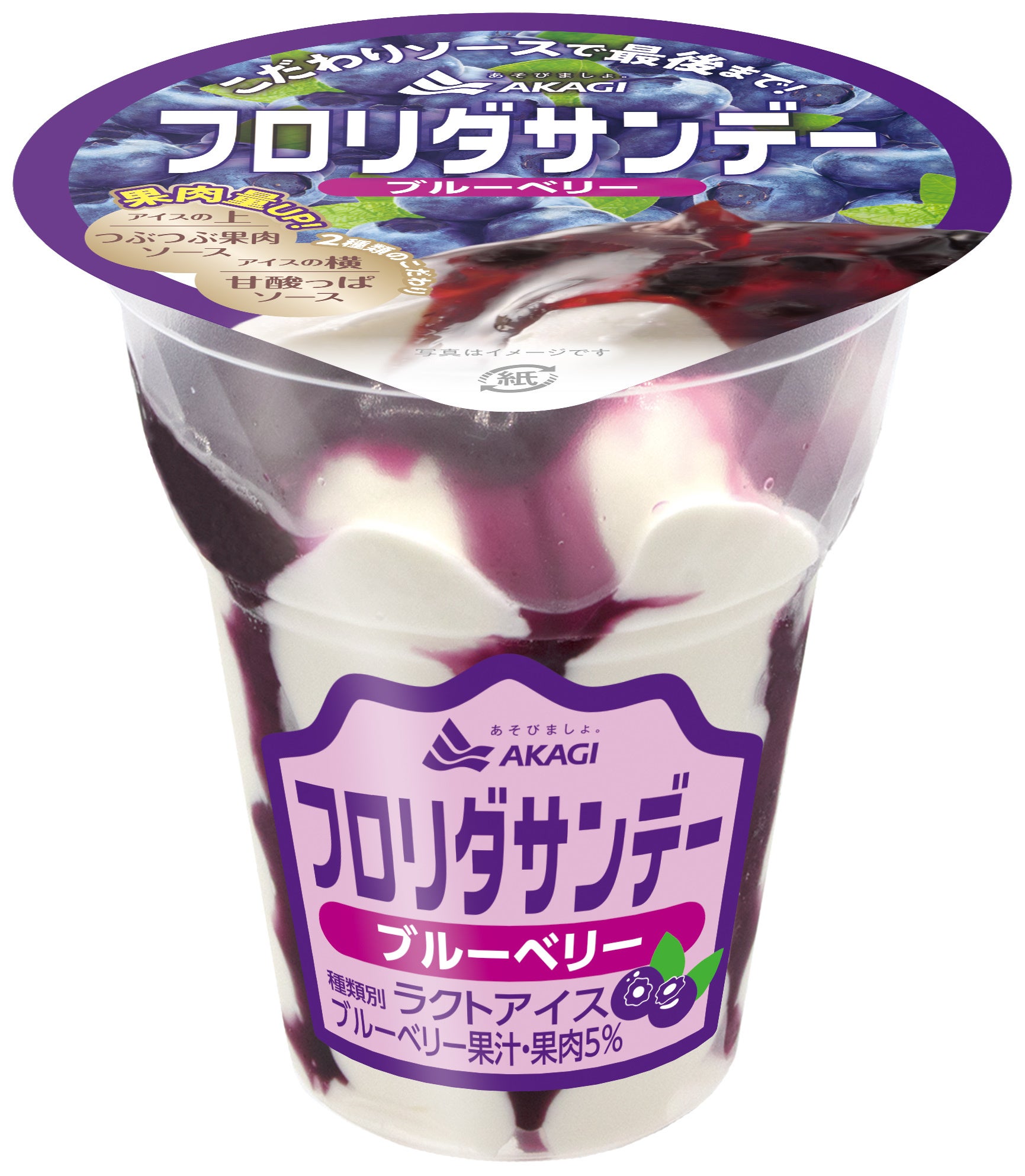 「フロリダサンデー」は、1980年代に発売していた商品の復刻版で、たっぷり入ったソースとアイスが特徴のサンデーアイスです。たっぷりのミルクアイスを最後まで楽しめるように、天面と側面で異なるオリジナルソースを使用しています。チョコレートは生クリームを10%配合した生チョコソースを天面に使用、ブルーベリーは、つぶつぶとした食感を残した果肉入りソースを使用し、ひとくち目から濃厚で満足感を感じられるように工夫しています。