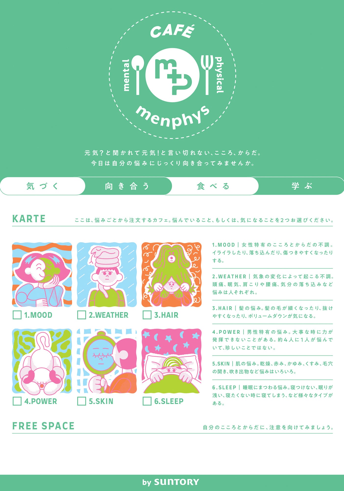 サントリー食品インターナショナル(株)は、8月23日(金)から、“人に言いづらい若者の悩みを、心と体の両面からサポートする”ことをコンセプトとした、「menphys(メンフィス)プロジェクト」※を始動します。その一環として、心身の不調や悩みに気づき、セルフケアを始めるきっかけをつくることを目的としたポップアップカフェ「~悩みごとから注文するカフェ~ CAFÉ menphys」を、8月30日(金)から9月1日(日)までの期間限定で、若者に人気の街・東京都下北沢にあるレストラン「PIZZERIA 8」内にオープンします。