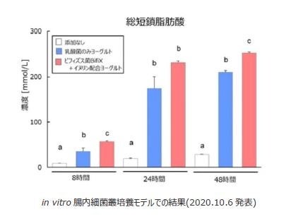 ビフィズス菌BifiXと食物繊維イヌリンを含むヨーグルトは、乳酸菌だけが使われているヨーグルトにくらべ、48時間培養後のタンサ(短鎖)脂肪酸量が有意に多い結果が認められました。