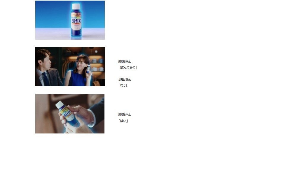 「BifiXヨーグルトドリンク」を迫田さんに手渡しするシーンがあったのですが、渡す時の絶妙な角度と迫田さんが握る様子を自然に見せるカットに苦戦して、何度もトライしたのが印象に残りました。