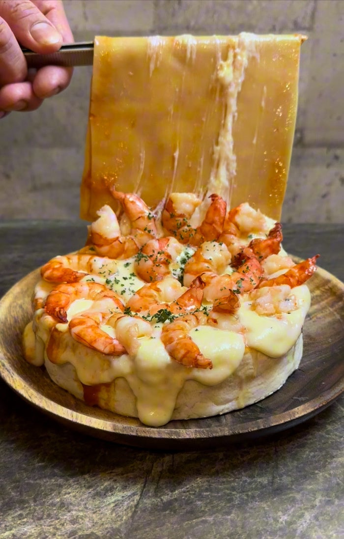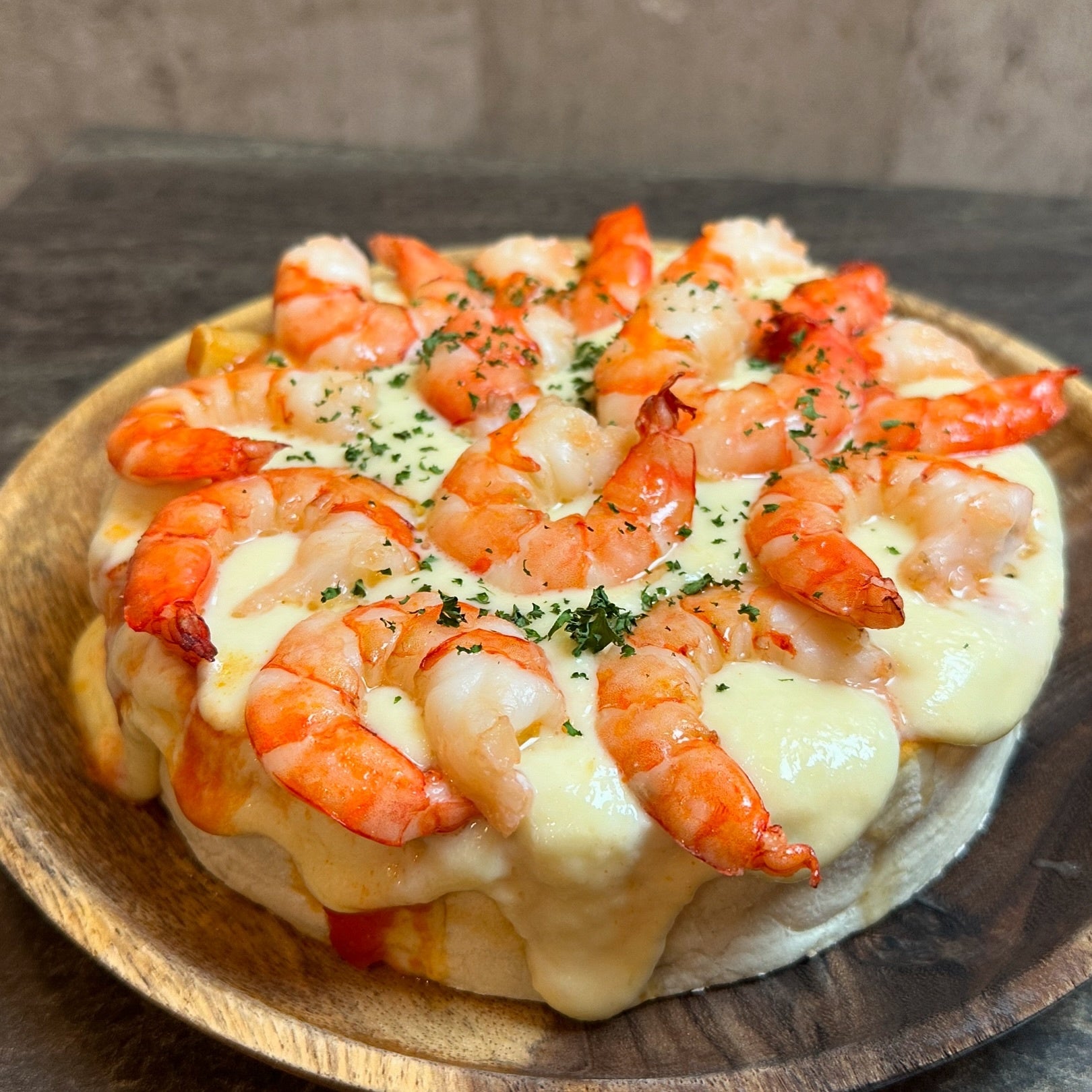 大ぶりなエビをゴロゴロ乗せたシカゴピザを食べられるお店。 プリプリで弾力のあるエビをチーズの海に浮かばせており、中にモチモチな一枚面も忍ばせており超ボリューミー! チーズの中にはオマール海老ソースが入ったエビ好きのための逸品で事前予約品になります! 一枚麺のシュリンプパスタシカゴピザは2900円です! |