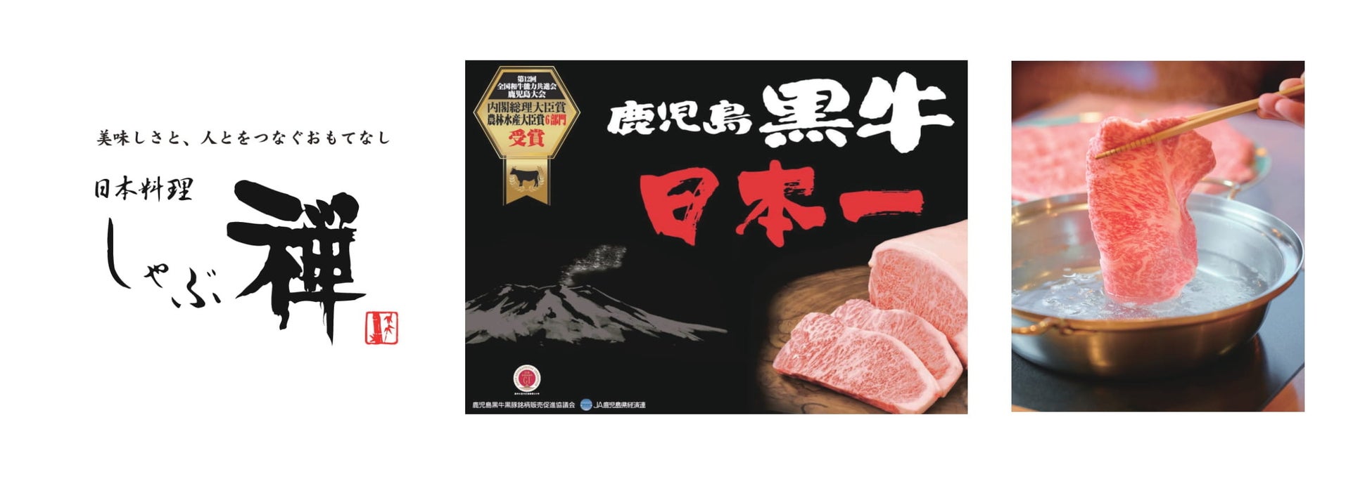 昨年12月、当社は創業40周年を迎えました。これを記念して、今年1月より40周年記念特別企画を展開。これまでに徳島県の「阿波牛」や、しゃぶ禅祭りにて「霜降り国産牛」を特別価格で提供するなどの企画を実施してきました。 この度、9月1日(日)より「鹿児島黒牛リブロース食べ放題」を通常価格13,000円のところ、特別価格の9,000円でご提供するフェアを、六本木、渋谷、銀座、四谷、神楽坂、川崎、梅田店の7店舗限定で開催します。 フェアの目玉である鹿児島黒牛は、「全国和牛能力共進会」で2大会連続日本一を獲得。2022年には内閣総理大臣賞を受賞した高級肉です。赤身ときめ細かいサシのバランスがよく、柔らかい肉質が特長。口に入れた瞬間にとろけるような食感と、しっかりとした肉の旨みをお楽しみいただけます。昨年の「しゃぶ禅祭り」でご提供した所、大変ご好評を頂き、創 業40周年記念コースでも再販することとなりました。 食べ放題では、お肉本来の旨味とやわらかな食感の「黒毛和牛赤身肉」、「国産豚」、「国産野菜盛り合わせ」も併せてご提供。毎日店舗で手作りする『しゃぶ禅』秘伝の胡麻だれ、ポン酢や和風出汁だれでご堪能いただけます。