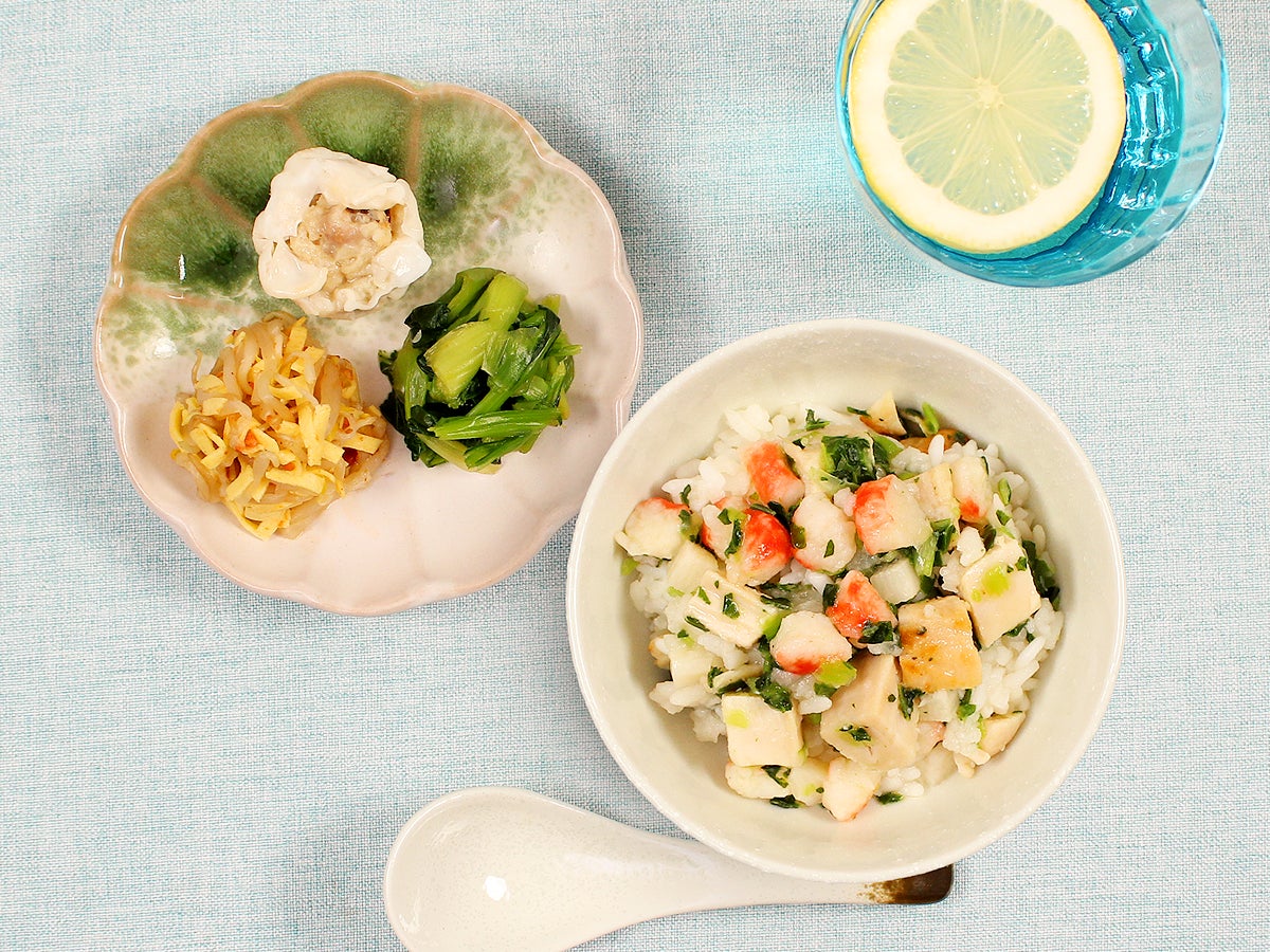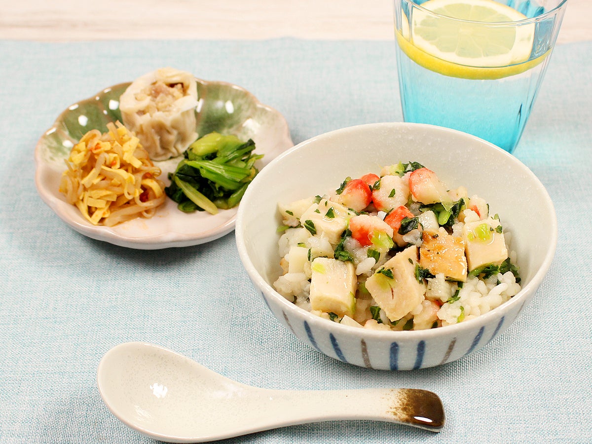 心も体も温まる、優しい味わいのメニューの登場です!小松菜はビタミンA、ビタミンC、カルシウム、鉄分などの栄養素が豊富な野菜であり、中でもビタミンCは疲労回復に効果があるとされています。あっさりとした味わいでありながら、鶏出汁の旨味がたっぷり溶け込み、この季節でも食べやすく仕上げました。朝食や軽食にもおすすめです!副菜もお粥の付け合わせにマッチするもの、トッピングしても楽しんでいただけるものを選びました!副菜は、もやしの辛味あえ、焼売、青梗菜オイスターです。