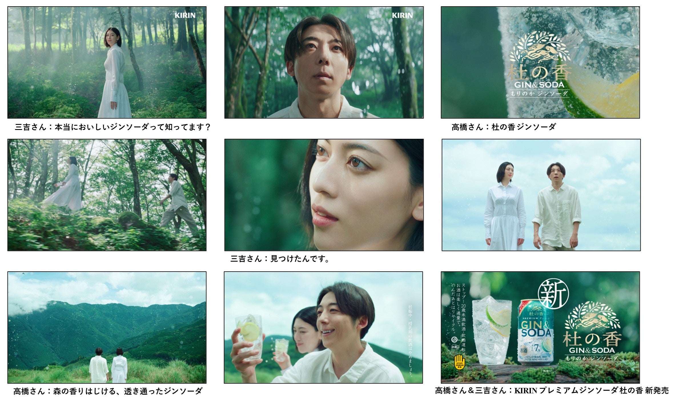 本CMでは、木の芽、そして壮大な森から気泡があがる爽やかで印象的なシーンが展開され、透明感のある「杜の香」の世界観を表現しています。深呼吸をしたくなるような壮大な森の中で、三吉さんの「本当においしいジンソーダって知ってます?」という問い掛けからはじまります。三吉さんが高橋さんを森へ導くようにストーリーが展開され、その中で「森の香りはじける、透き通ったジンソーダ、KIRIN Premiumジンソーダ 杜の香」の清涼感を伝えていきます。言葉数は多くはないものの、惹き込まれるような落ち着いた掛け合いや、森や大自然に包まれ、心もカラダもリフレッシュした、透明感溢れるお二人の姿に注目です。また本CMには、くるりの「ばらの花」をアレンジした楽曲を起用しました。楽曲による森を吹き抜ける風のような爽快感をご体感ください。