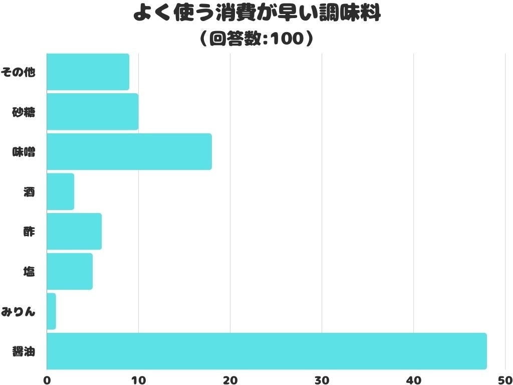 よく使う消費が早い調味料をアンケートにて調査したところ、1位は「醤油」でした。