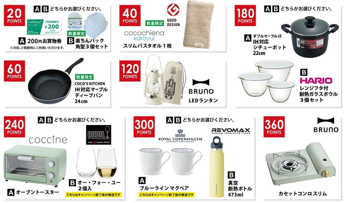 「クックハウス」「ダイヤ製パン」でお買い上げ200円(税込)ごとにシール1ポイント進呈。シールを集めて、ポイントに応じた景品ともれなく交換できます。(一部限定数量景品あり)