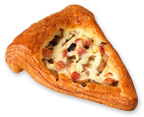 舞茸・エリンギ・ぶなしめじ・ひらたけの4種類のきのことベーコンをのせたグラタンデニッシュです。