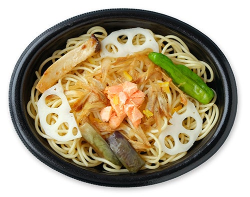 サーモンやエリンギ・秋野菜をトッピングした白だし仕立ての和風パスタです。