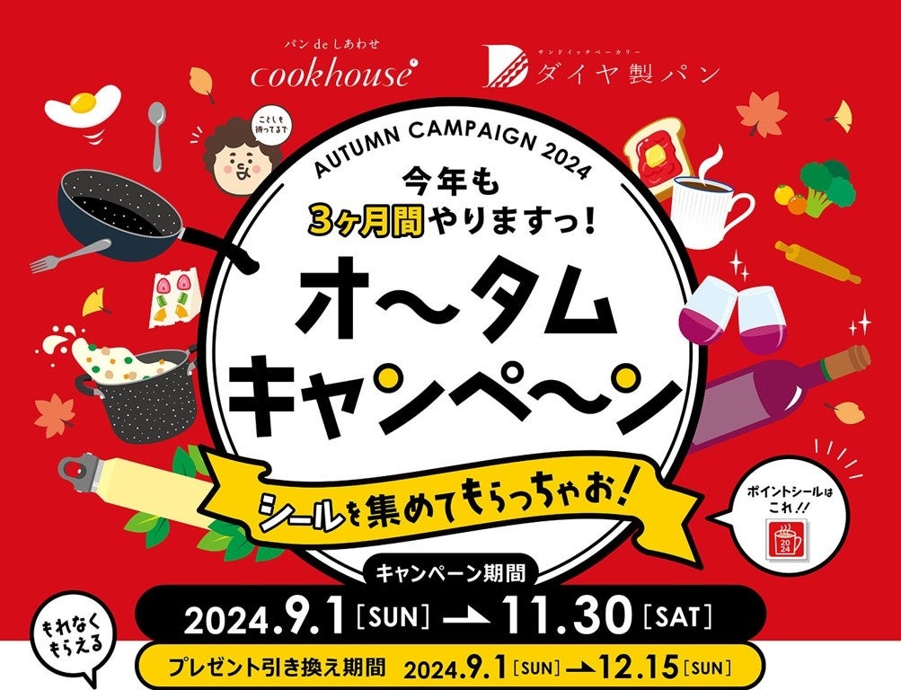 今年創業78周年の株式会社ダイヤ(本社︓⼤阪市⽣野区新今⾥代表取締役社⻑︓多⽥俊介以下ダイヤ)が運営する「クックハウス」と「ダイヤ製パン」は、9⽉1⽇(日)〜11⽉30⽇(土)の3ヵ⽉間、ポイントを集めて素敵なプレゼントと交換できる「オータムキャンペーン」を開催します。今年は、持つよろこび、使う楽しさに加え、目新しさ、高級感などワクワクするものというポイントで景品をご用意いたしました。