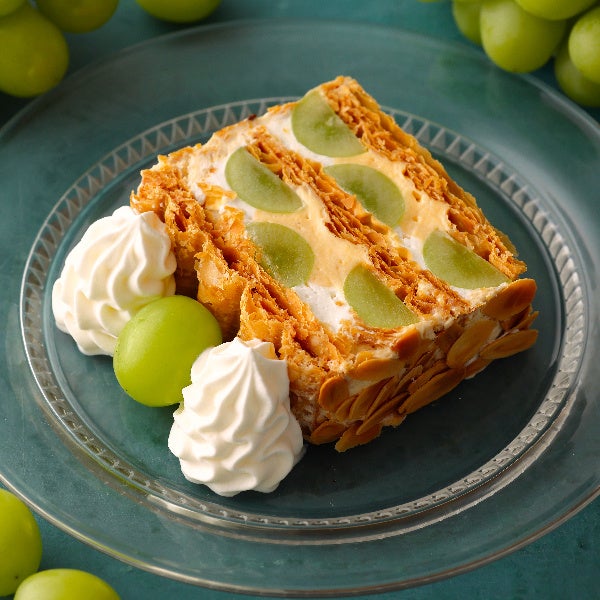 フェアの期間中楽しめる「KIHACHIのシャインマスカットパイ」のほか、前半には、焦がしバターを加えた自家製クレープをフレッシュの葡萄や甘酸っぱい巨峰ソースと味わう「シャインマスカットと巨峰のクレープ」、後半にはシンプルな美味しさが際立つ「シャインマスカットと巨峰のショートケーキ」が順次登場します。