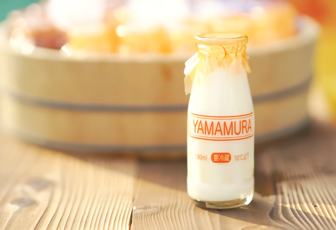 提供メニューには、定番商品の「山村ぷりん」や「みるくなアイス」、フルーツ牛乳「山村フルーツ」のほか、今年8月に発売されたばかりの新商品「山村ジョージアフローズンヨーグルト」をラインナップ。懐かしい瓶入りの牛乳やプリンに心が躍ります。山村乳業ならではの芳醇な牛乳のコクも魅力です。