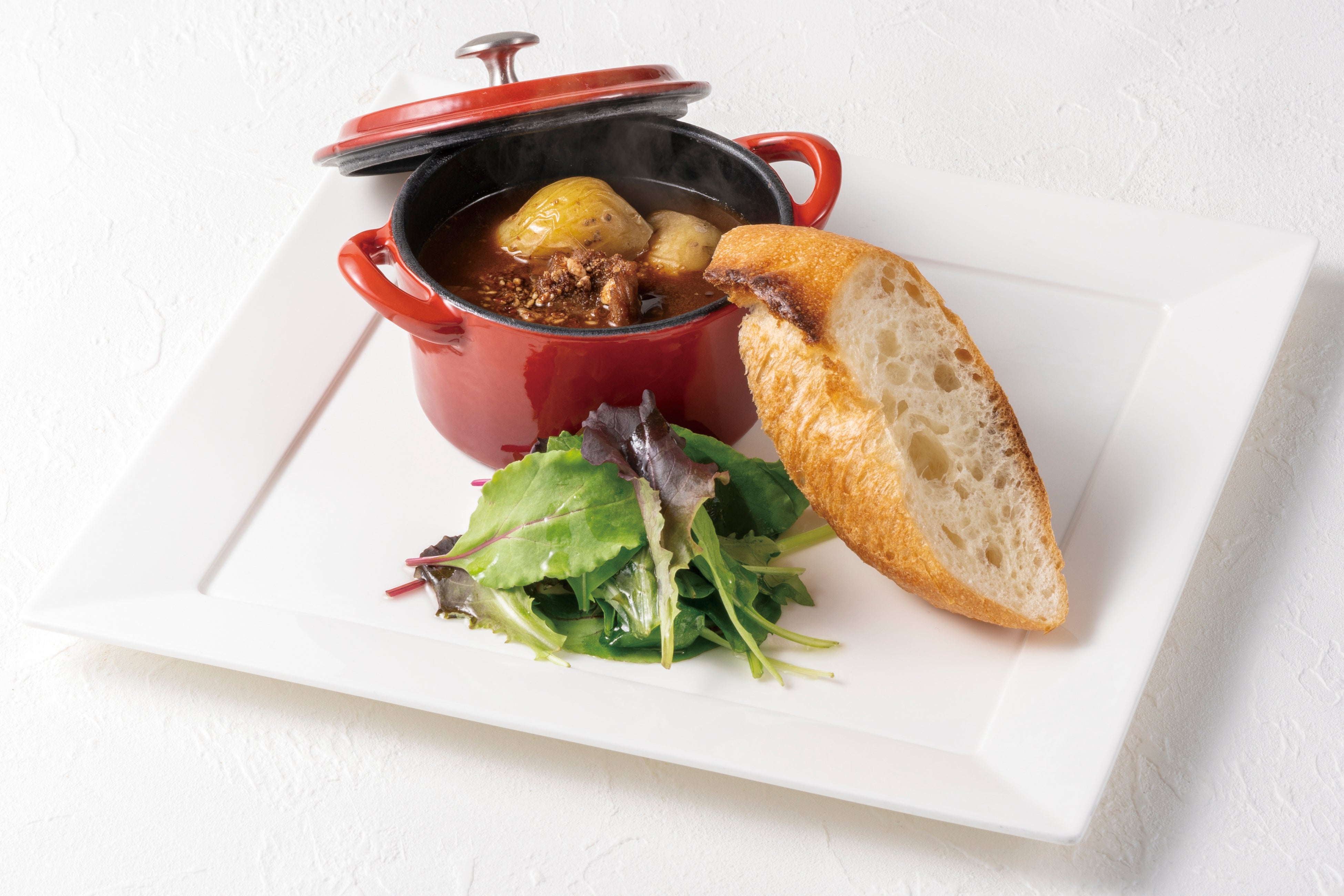 グラスドビアン(牛だし)とマデラワインを使った芳醇な香りの牛タンのビーフシチュー。隠し味にカカオバターとカカオデュカを使用した、深いコクを感じるゴディバカフェオリジナルシチューです。