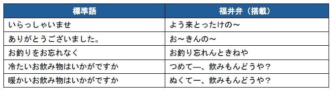 本自販機は、今春、北陸新幹線が福井県まで延伸したことを受け、さらなる福井県の魅力PRに自動販売機を使って貢献できればと、福井県交流文化部魅力創造課恐竜戦略室と共同で企画したもので、商品選択ボタン押下時に、恐竜(フクイラプトル、フクイサウルス)の鳴き声を発声するとともに、「よう来とったけの~」(いらっしゃいませ)「お~きんの~」(ありがとうございました)など福井弁によるオリジナルメッセージが流れる機能を搭載し、本自販機を紹介するトップボードを貼り付けています。