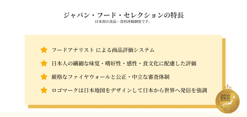 2013年より行われている日本初の食品審査制度「ジャパン・フード・セレクション」では、23,000人のフードアナリストによる厳正な評価で、消費者に信頼される高品質な製品を選定しています。味覚や品質に基づく受賞は、製品のブランド価値を向上させ、消費者の購買意欲を高めます。受賞企業は、信頼性の高いプロモーション効果を得ることができ、市場での競争力を強化することを目的とします。