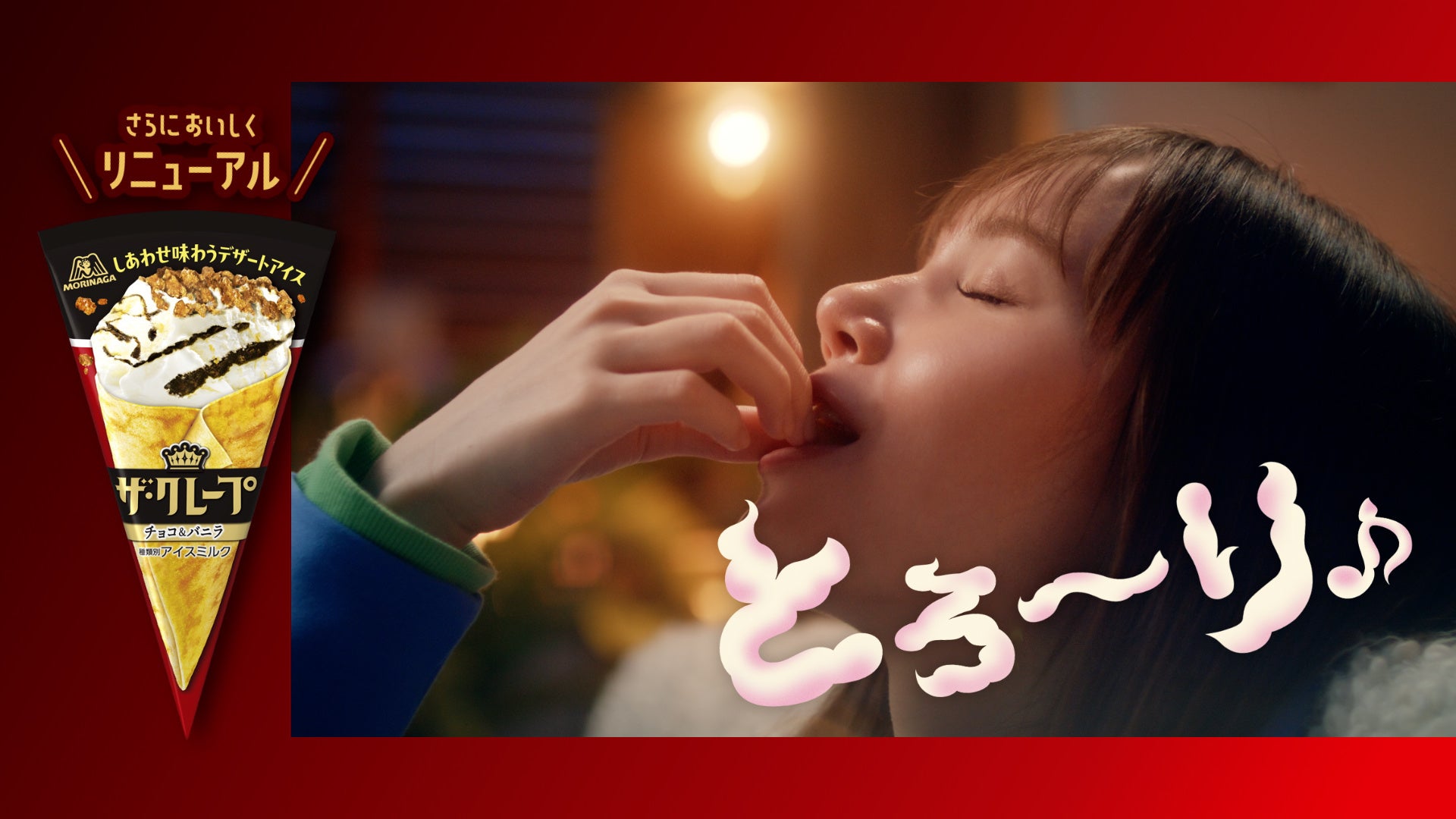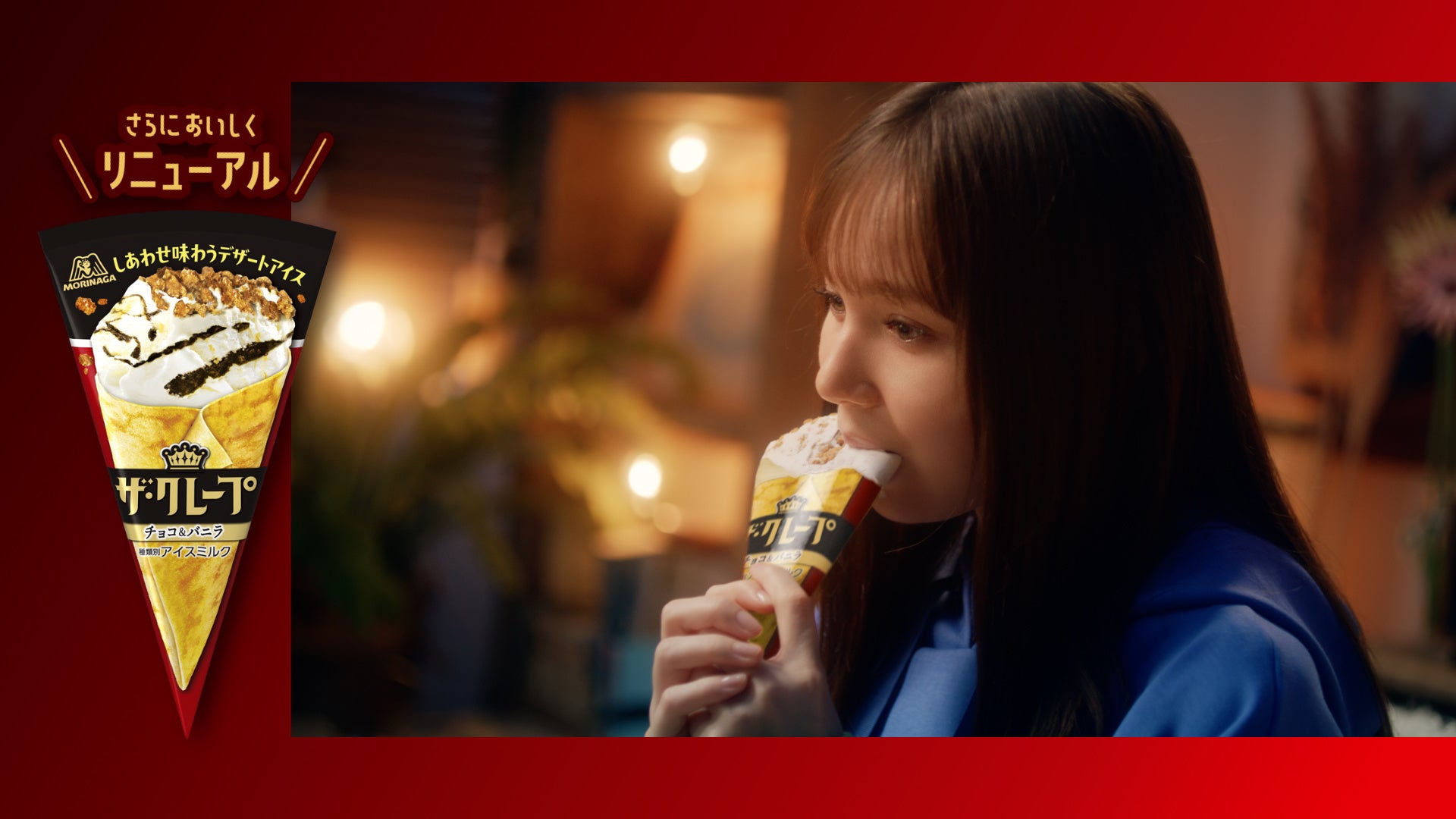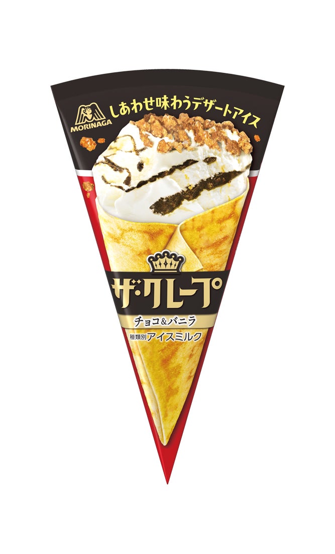 「ザ・クレープ<チョコ&バニラ>」は、特徴的な三角形の華やかな見た目と、もちもちのクレープ生地・チョコ・クリームの変化する食感で、しあわせな気分にしてくれるクレープアイスです。2022年春から通年販売を開始し大変ご好評いただいており、今年の4‐6月では過去最高売上を記録するなど、人気上昇中の商品です。今回のリニューアルでは、アイスの乳固形分をアップしさらにリッチに、チョコも配合を変更することでお客様にデザート感やしあわせ気分をより味わっていただけるように仕上げました。また、パッケージは、赤と黒の華やかな印象は残しつつスタイリッシュに、アイス本体が際立つデザインに生まれ変わりました。