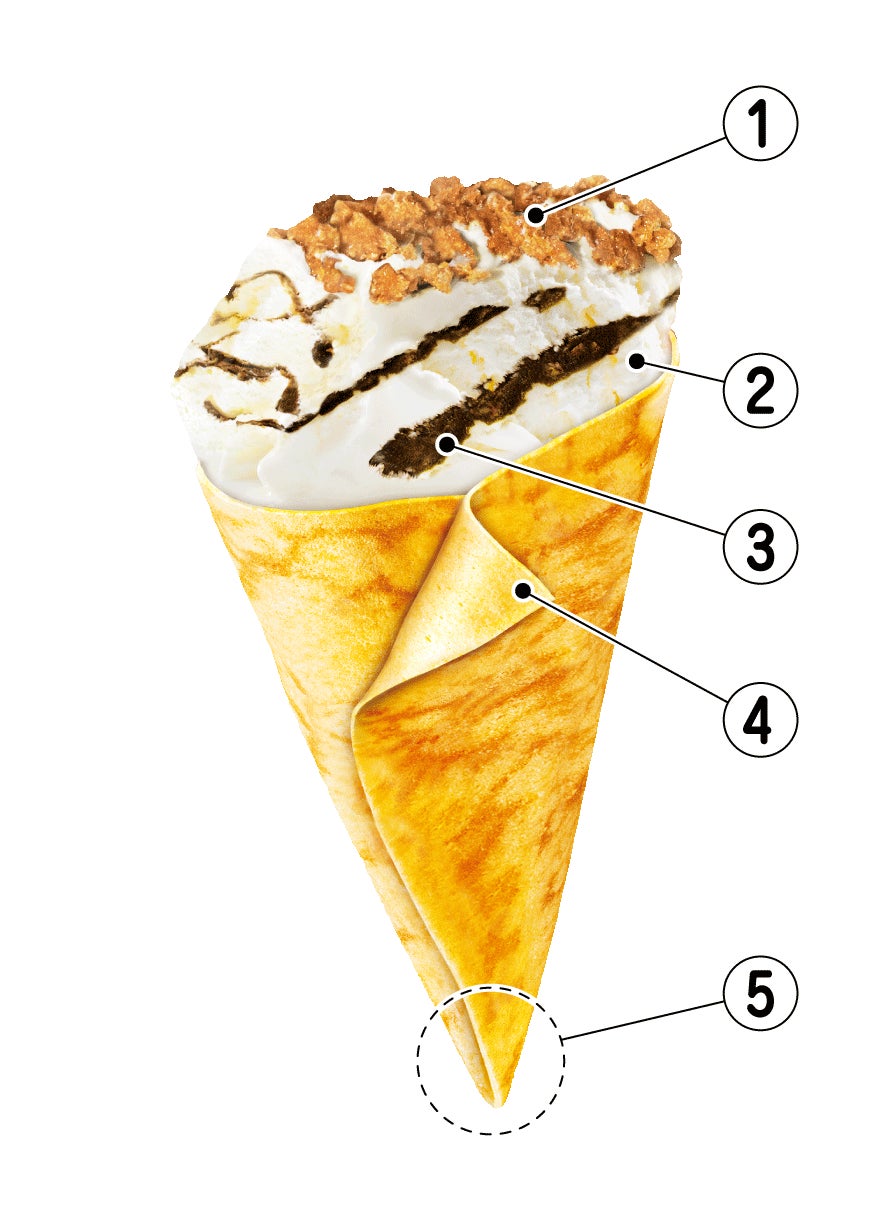 「ザ・クレープ<チョコ&バニラ>」は、バニラアイスやザクザク食感のチョコを、冷凍でもしっとり・もちもち食感のクレープシートで包んだクレープアイスです。特徴的な三角形の形に加え、品質には5つの特長があり、食べ進めるごとに変化していく食感をお楽しみいただけます。