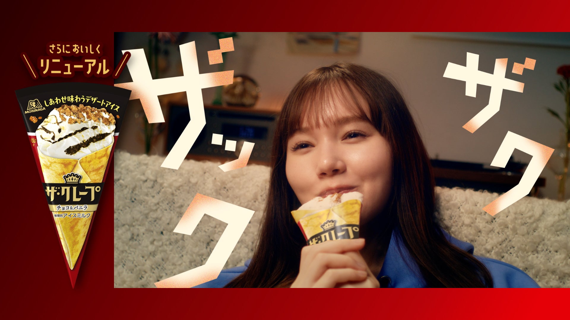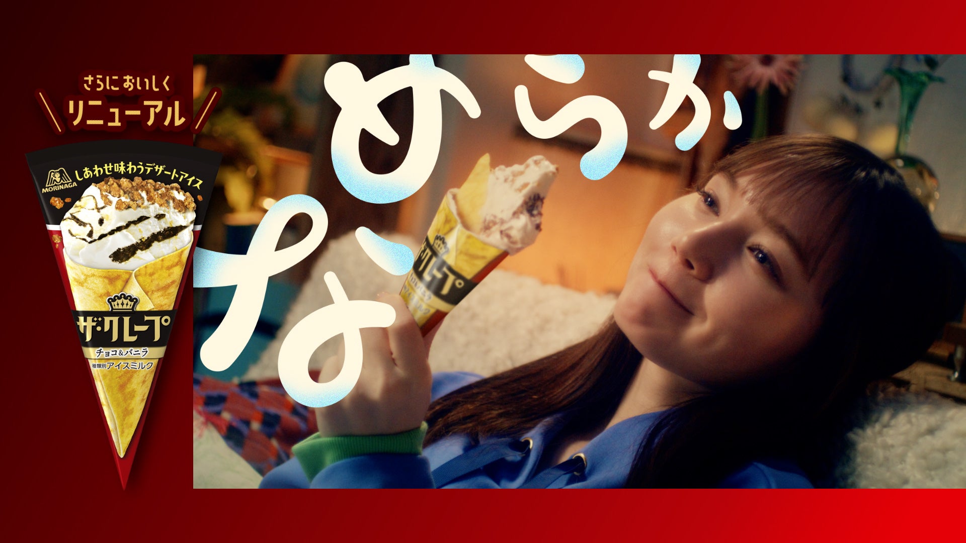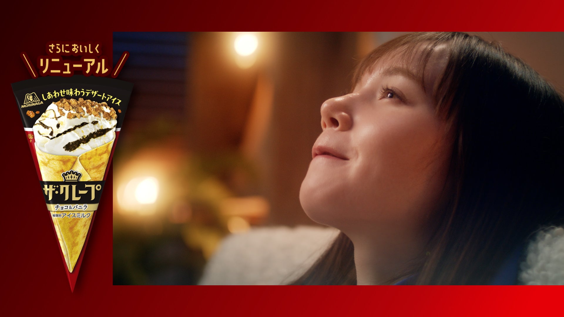 CMストーリー:今日のご褒美アイスは、ザ・クレープ。一口食べると、あまりの美味しさで幸せな笑顔になるマーシュ彩さん。なめらかなバニラアイス、その中のザクザク食感のチョコ、もっちもちのクレープ… 食べ進める毎に変化する食感をたのしんで、最後はとろ~りホイップクリーム部分を頬張って幸せを感じます。リニューアルしたザ・クレープに大満足のマーシュ彩さんでした。