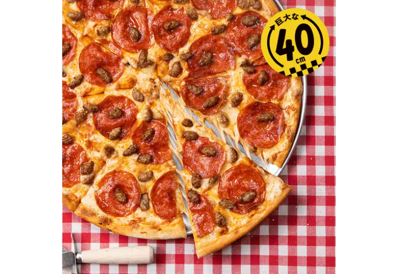 本場ニューヨークに行った際に、インスピレーションを受けて開発された商品です。直径40cmのピザに、ペパロニとハーブをきかせたイタリアンソーセージをトッピングしているので、ジューシーさを堪能いただけます。薄く伸ばしてあるので、二つ折りにして食べれば、まさにアメリカンスタイル!