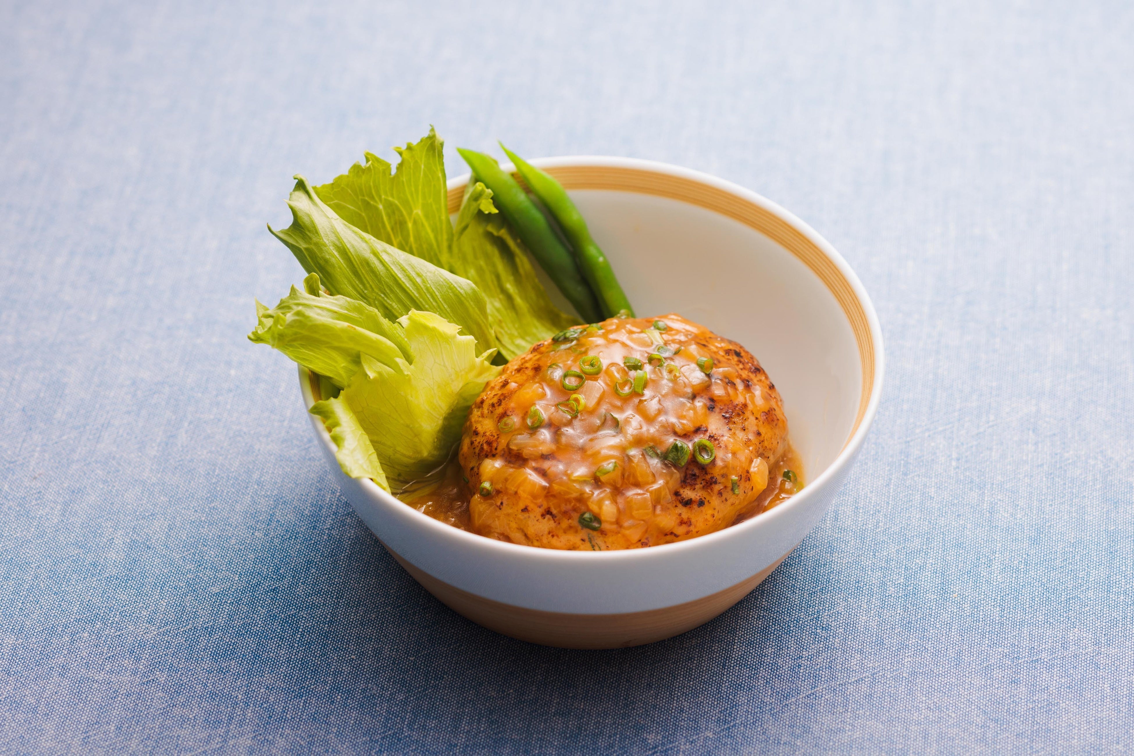 だしでふっくら煮込んだハンバーグに玉葱の甘みとかつお節だしを利かせたソースをかけました。