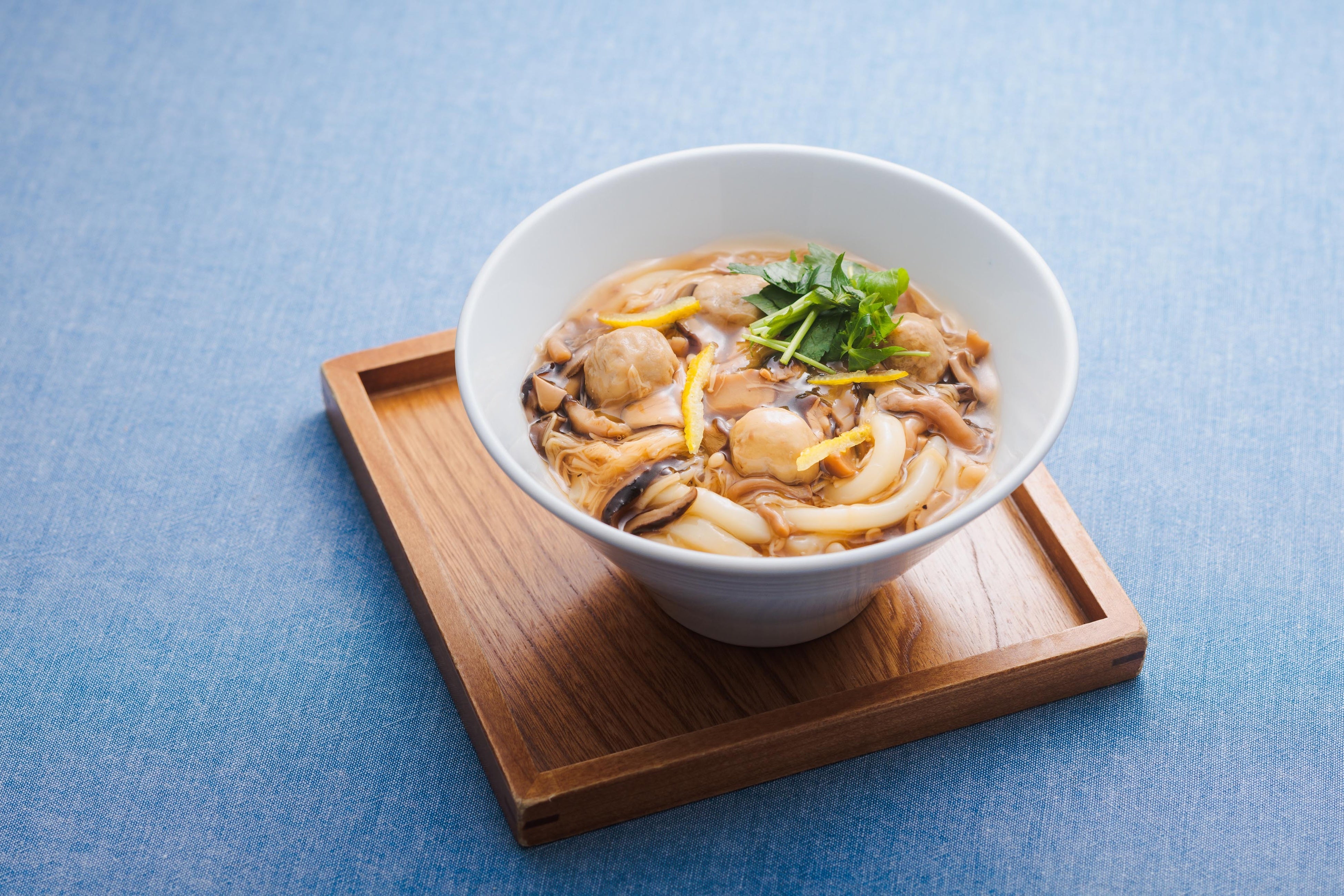 きのこの旨味と合鴨のコクが効いた柚子香るうどんです。
