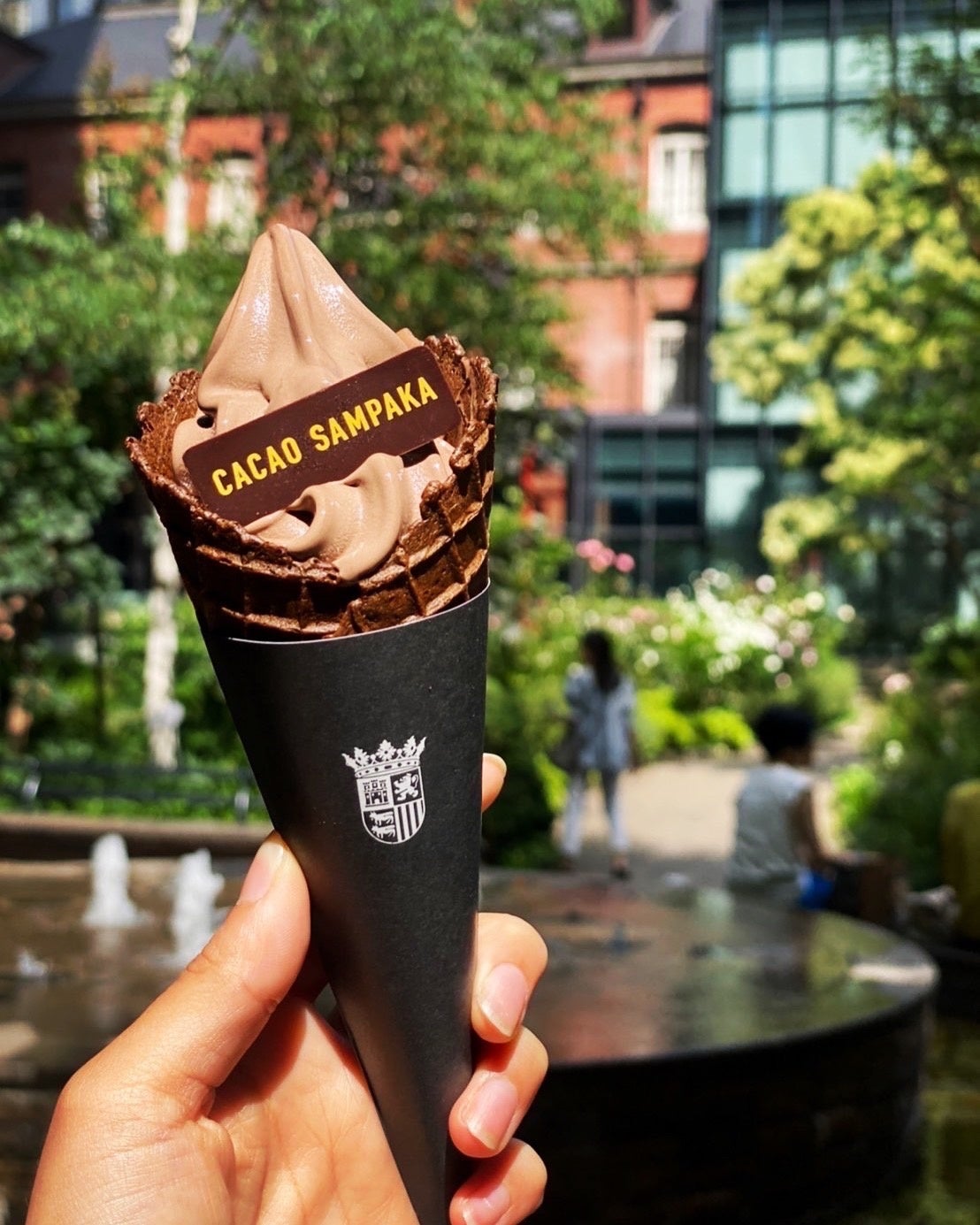 「CACAO SAMPAKA」のロゴチョコレートが付いたソフトクリームは、丸の内本店が創業当初から販売している人気のソフトクリームで、最高級の香り高いカカオパウダーを贅沢に使用し、豊かなカカオの風味をお楽しみいただけ、濃厚ながらすっきりとした味わいです。