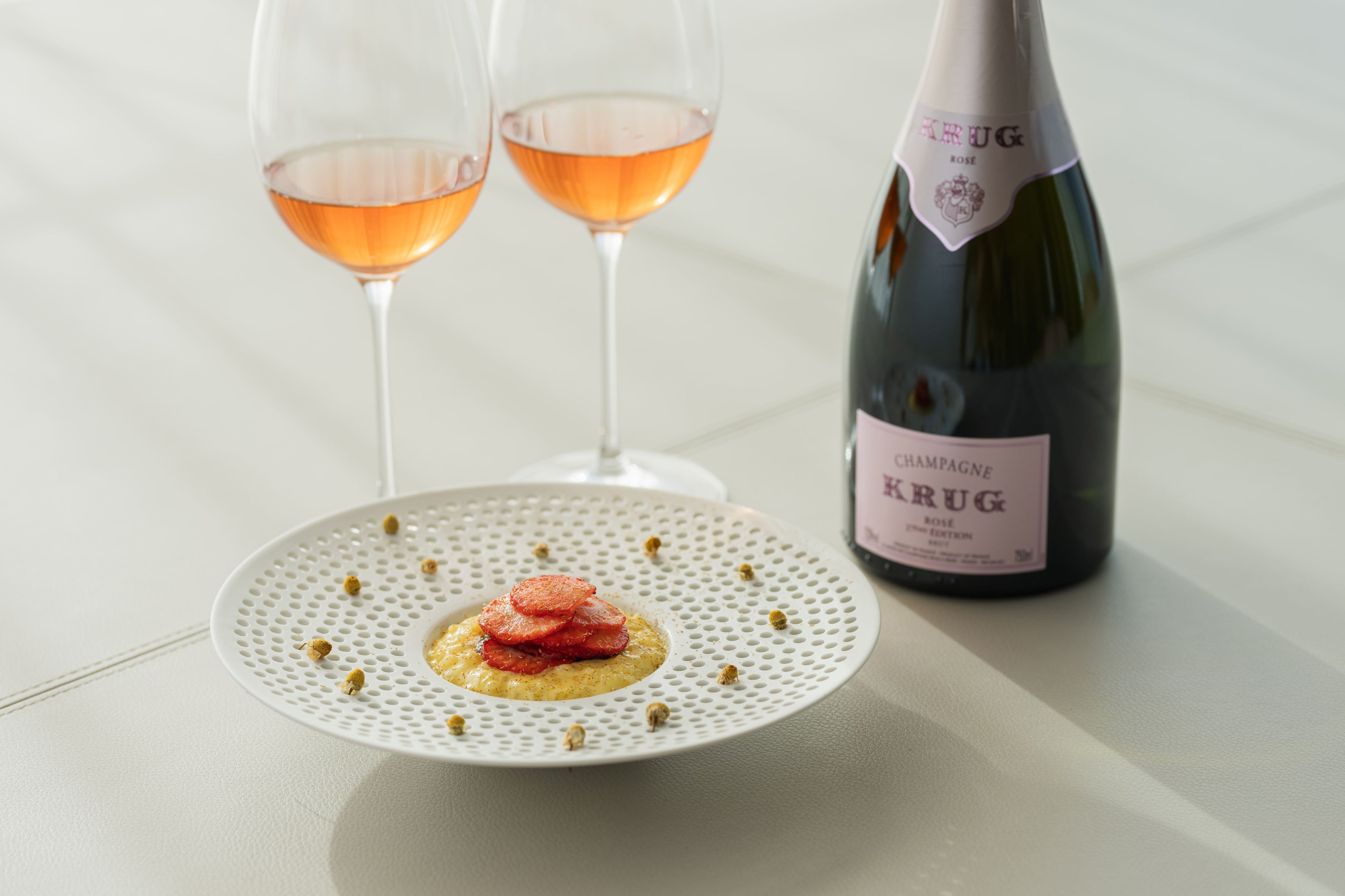 いちごの甘酸っぱさと優しいカモミールの香りが、クリュッグ ロゼ 28 エディションのフルーティで華やかなノートを引き立てる、まるで夏のイングリッシュガーデンのような一皿です。