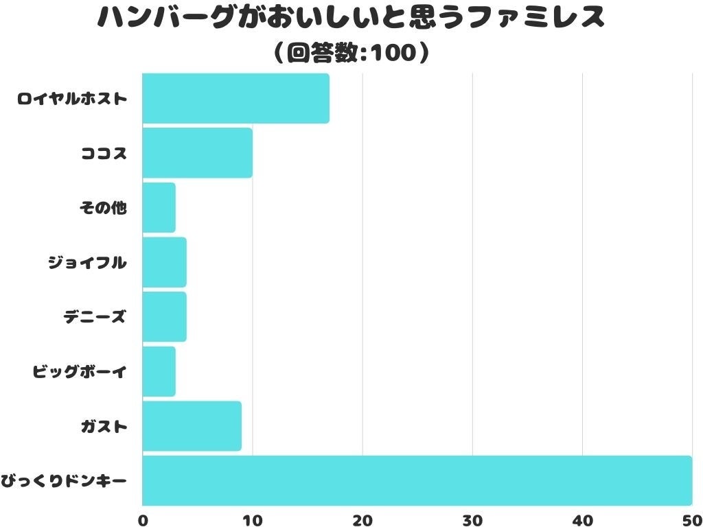 100人にアンケートを行ったところ、「びっくりドンキー」と回答したのは全体の50.0%でした。