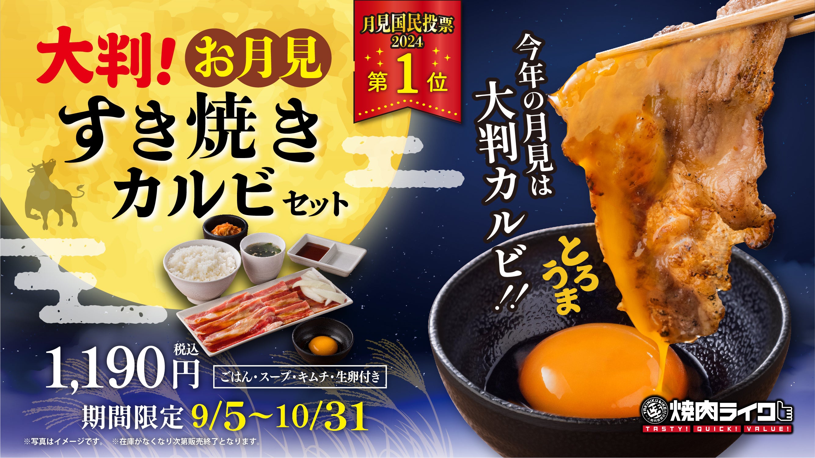 概要: お客様に未発売の3つの月見メニュー(「お月見焼き牛丼風定食」、「大判!お月見すき焼きカルビセット」、「お月見焼肉バーガー」)からどの商品を販売するかをX(旧Twitter)で投票。最も多くの支持を集めた「大判!お月見すき焼きカルビセット」が1位に選ばれ、9月5日(木)より期間限定で販売開始。