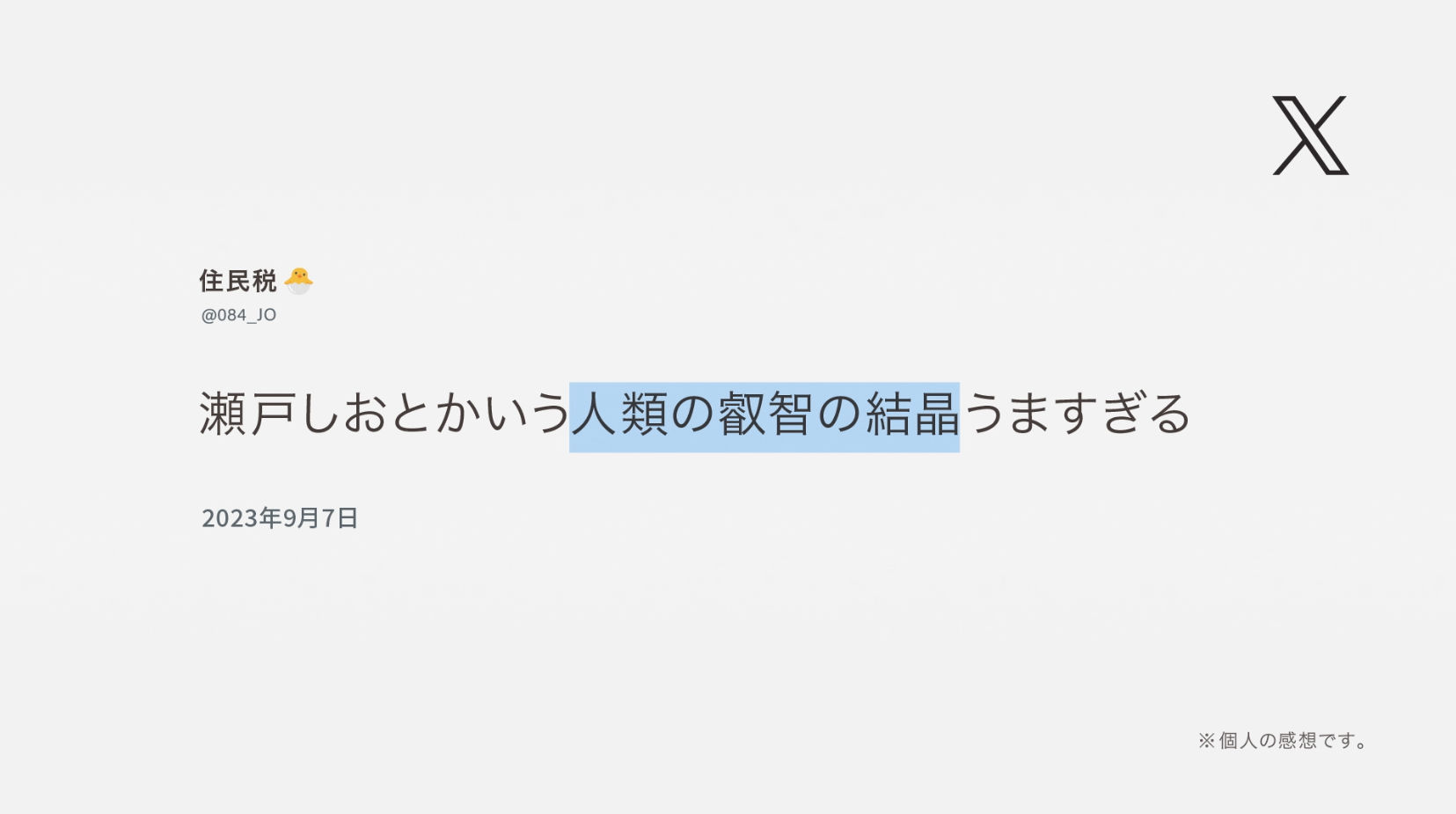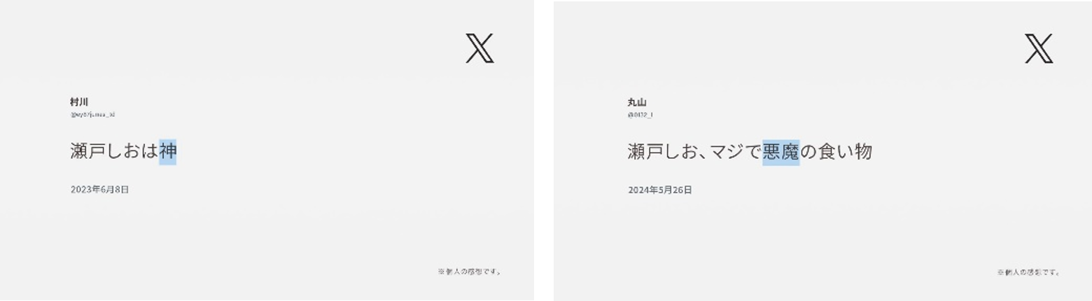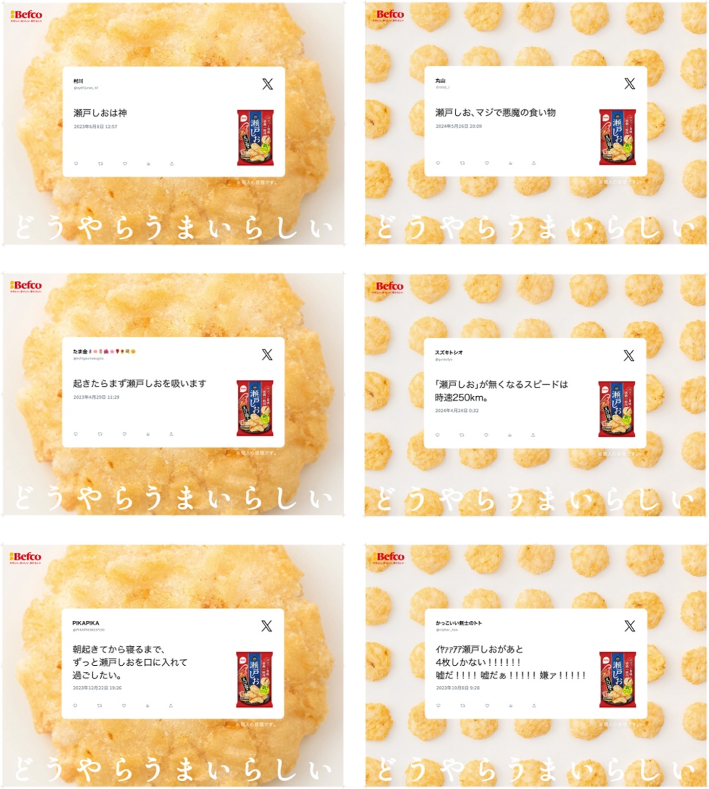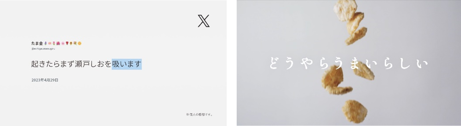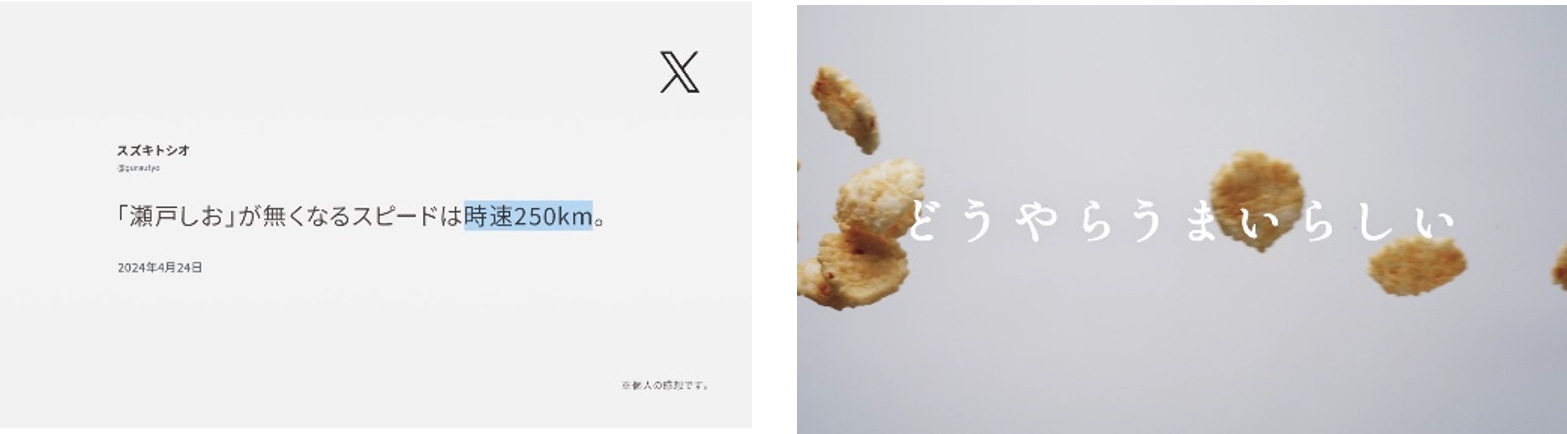 瀬戸しおは、『知る人ぞ知る』おせんべいで、実際にX(旧Twitter)で検索してみると、とても沢山の『知る人』の投稿を見ることができます。今回はその中からユニークなコメントをされている方に直接許諾をいただき、その生の声を広告に反映させていただきました。いわゆる広告コピーとは一味違う語感を楽しむことができます。ぜひご注目ください。