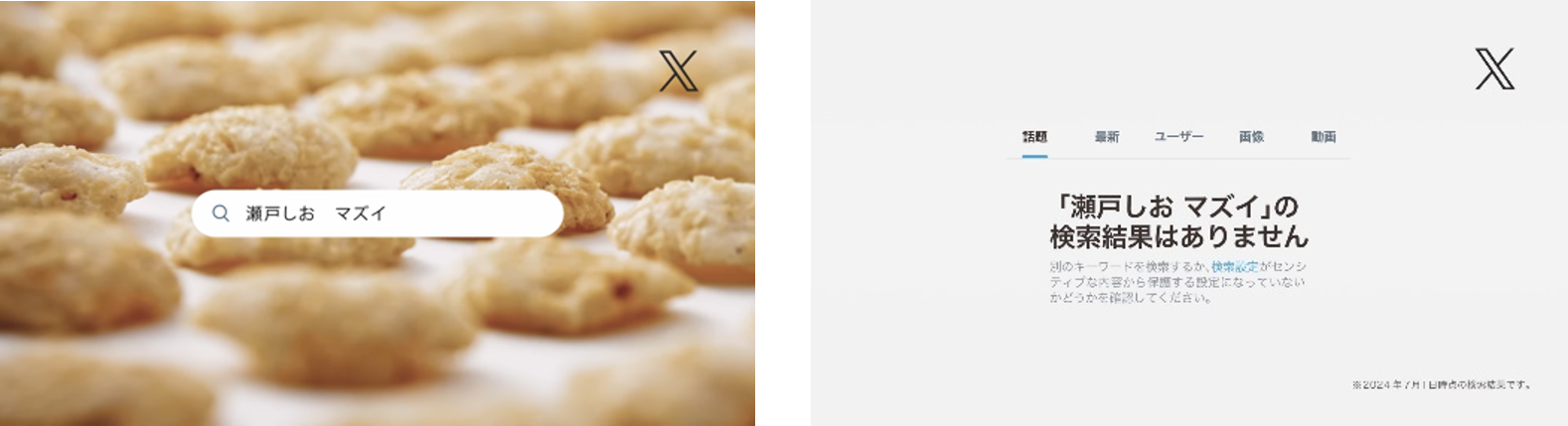 Xでの「瀬戸しお」検索を呼びかけ、実際にあったポストを紹介。「人類の叡智の結晶」、「煎餅界最強」、「神」といった、瀬戸しおに寄せられたユニークなコメントにご注目ください。