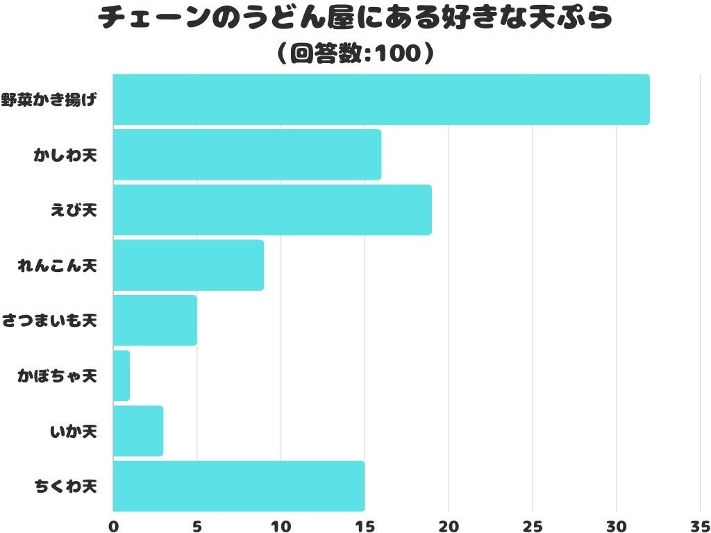 チェーンのうどん屋にある好きな天ぷらをアンケートにて調査したところ、1位は「野菜かき揚げ」でした。